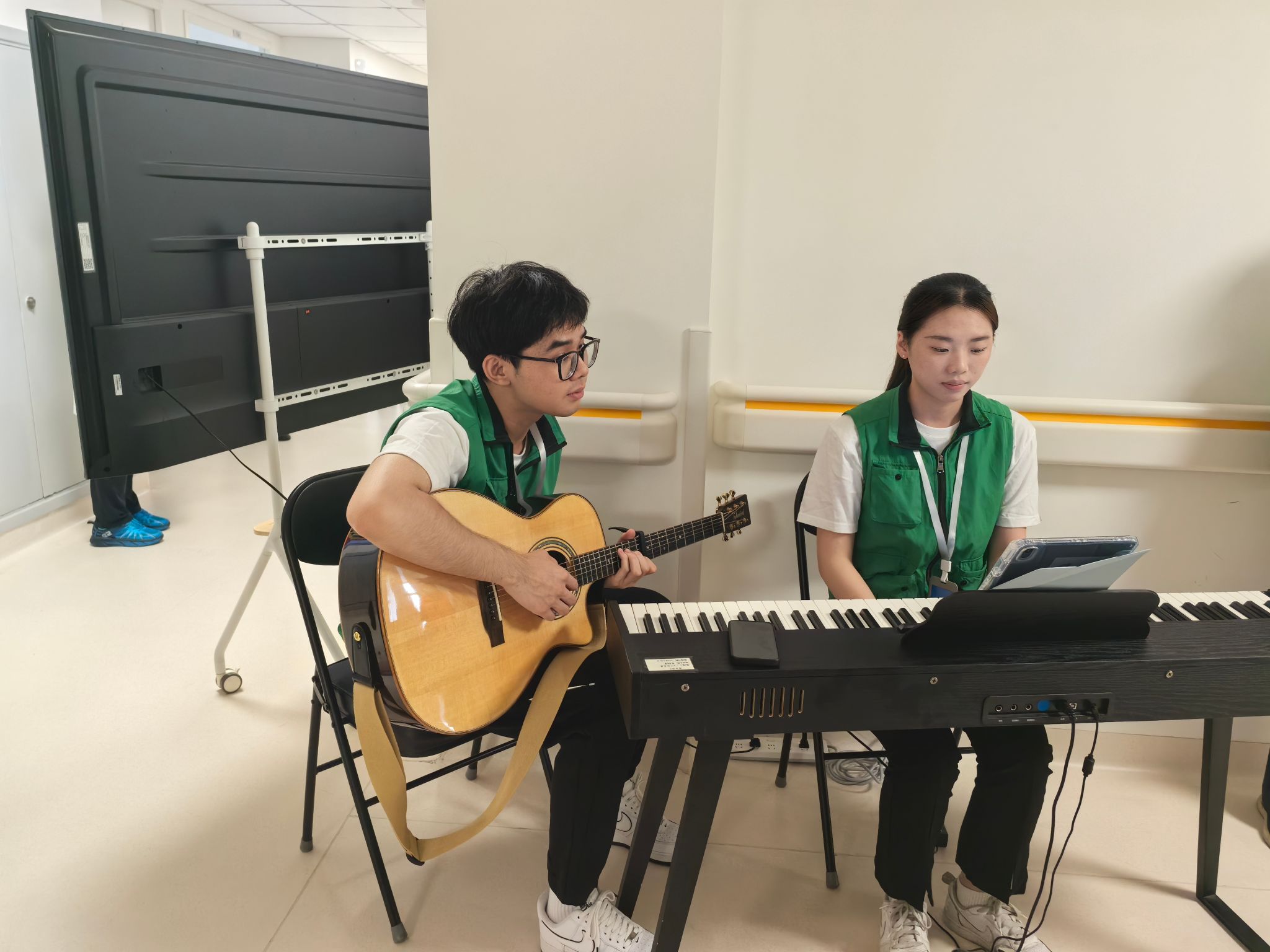 2024年9月30日下午,音乐治疗专业的师生们与海医安宁志愿者合唱团成员们已投入紧张的排练之中,以实际行动诠释着对生命的尊重与呵护。