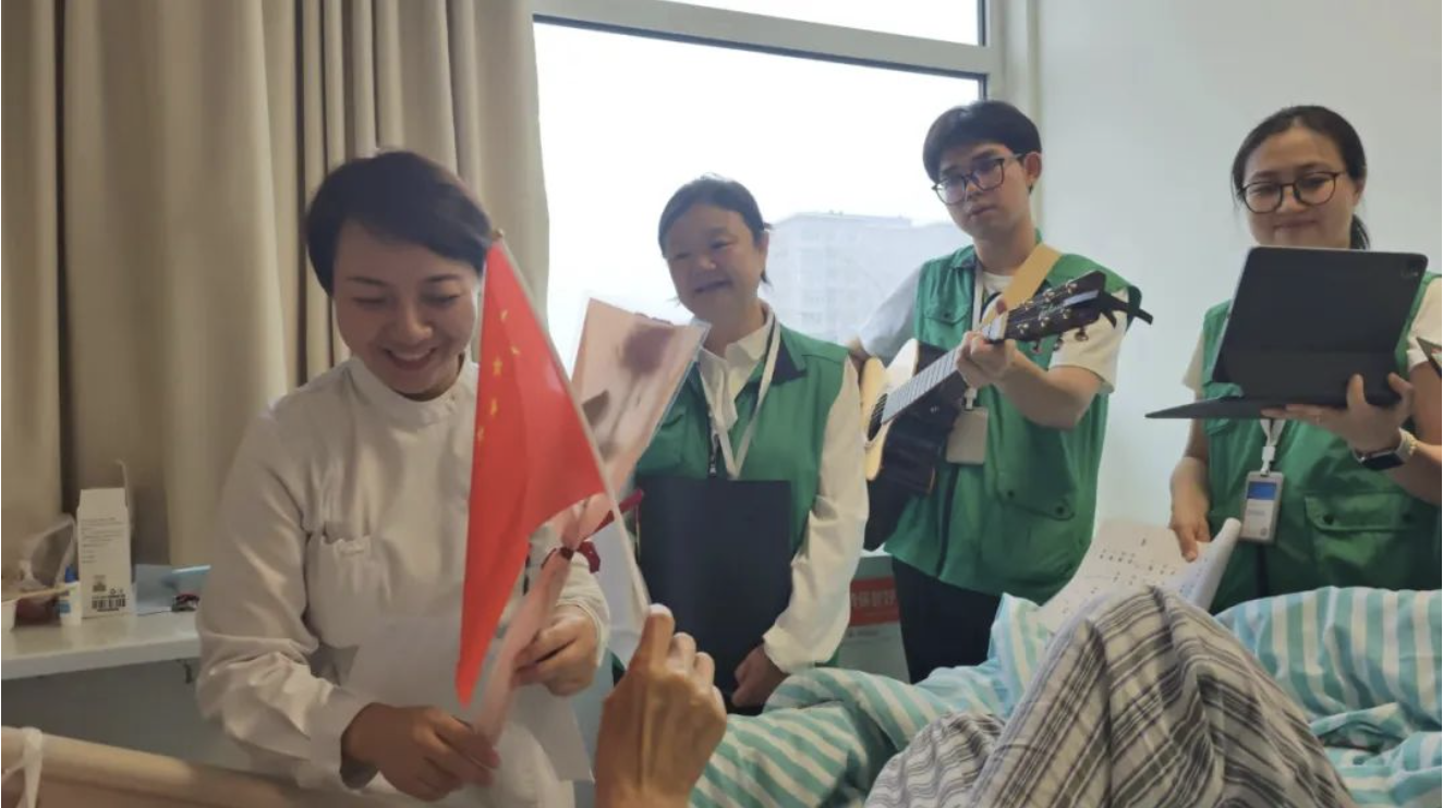 在共同纪念国庆佳节的时刻,在场的人一起沉浸在音乐声中。旋律再度悠扬响起,有的患者闭目凝神,面容舒展;有的患者轻声吟唱,和声共鸣;还有患者手持国旗,轻摆轻摇,与周围众人共襄盛举,分享这份独特的喜悦与自豪。病房之内,歌声宛如潺潺流水,连绵不绝,仿佛时光在这一刻静止,深切体会音乐的深远韵味与无穷魅力。