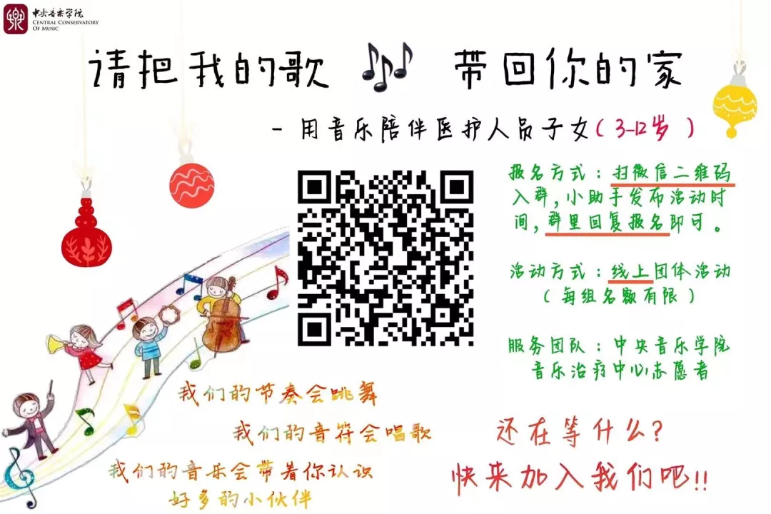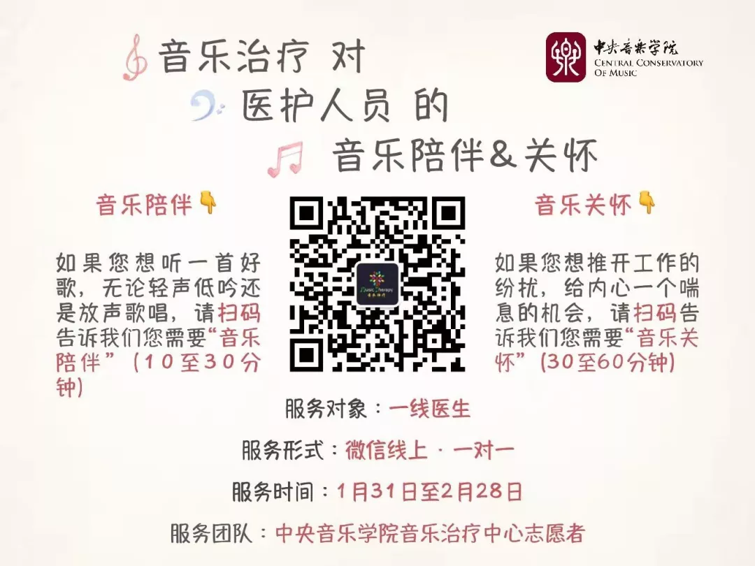 KY开元集团官网音乐治疗志愿者们发挥音乐治疗师生的专业特长,为一线医护人员以及其子女开展线上音乐治疗志愿服务。针对一线医疗人员进行音乐治疗线上干预,干预主要采用生理心理社会模式(Biopsychosocial),使用循证音乐治疗实践,分级对一线医护人员进行音乐治疗志愿服务。干预主要分为两个层次: 指导医护人员进行自我关怀和与医护人员进行音乐陪伴。该设计可实施操作性强,干预时间短,能够在不打扰一线人员紧张工作的同时,及时地处理医护人员的情绪问题,保证其心理健康。目前志愿者团队为武汉市第九医院,武汉大学人民医院,武汉市第七医院的医护人员提供音乐志愿服务。