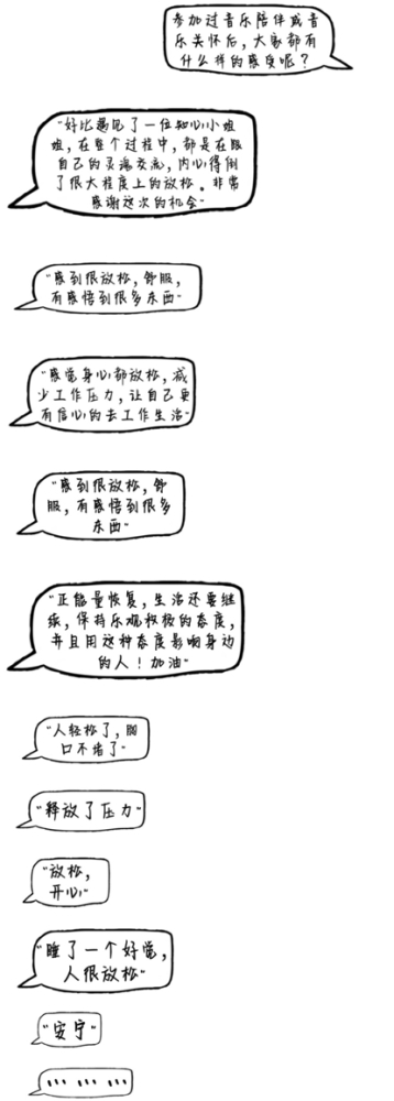 这是个特别的三十天,遇见了一个很温暖很有支持感也很专业的音疗大家庭,听了很多这辈子可能都不会再听到的故事,也翻新了我对人类情感以及社会责任感的认知。你们在黑暗中照亮着所有人,希望我们也能用音乐让你们感受到明亮和温暖。