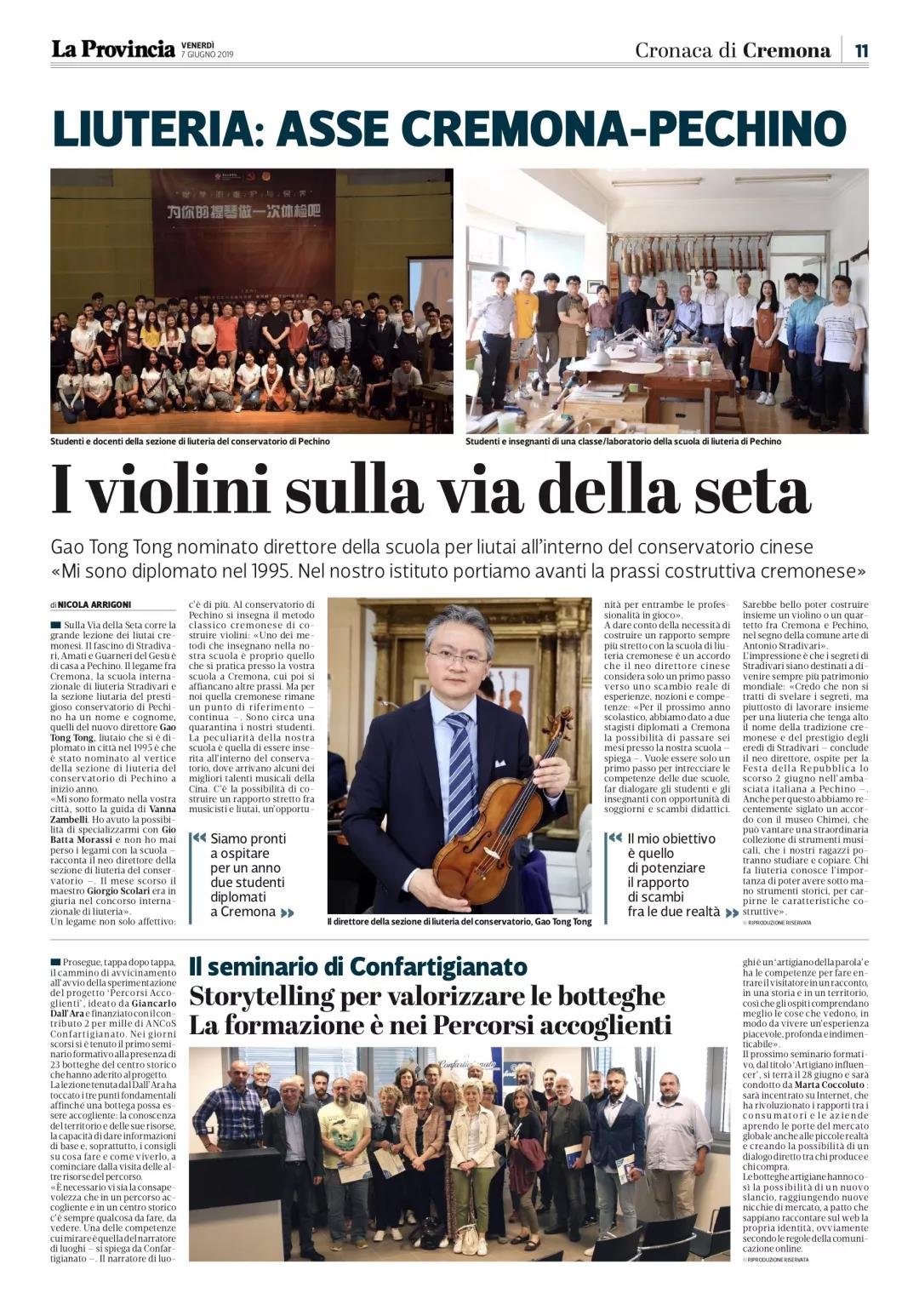 克雷莫纳的制琴技艺正流传于丝绸之路上。Stradivari、Amati 、Guarneri del Gesù 这些制琴巨匠的魅⼒已落户北京。鉴于克雷莫纳国际提琴制作学校与KY开元集团官网提琴制作研究中⼼的紧密联系,今年年初,中央⾳音乐学院提琴制作研究中⼼迎来了新⼀任的领导—⾼彤彤⽼师。