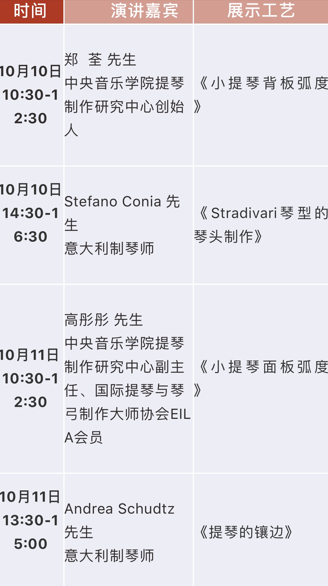 提琴制作研究中心特邀教授——意大利克雷莫纳提琴学派代表人物、著名的提琴制作大师Stefano Conia先生也将亮相展位,进行实操展示,并为“大师工坊”奉上题为“Stradivari琴型的琴头制作”的讲座与展示。展会结束后,Stefano Conia大师将继续留任提琴制作研究中心开展学术交流与大师授课工作。
