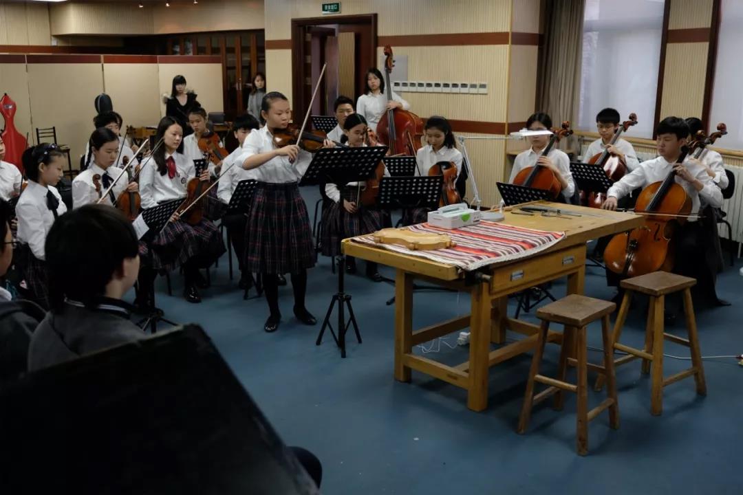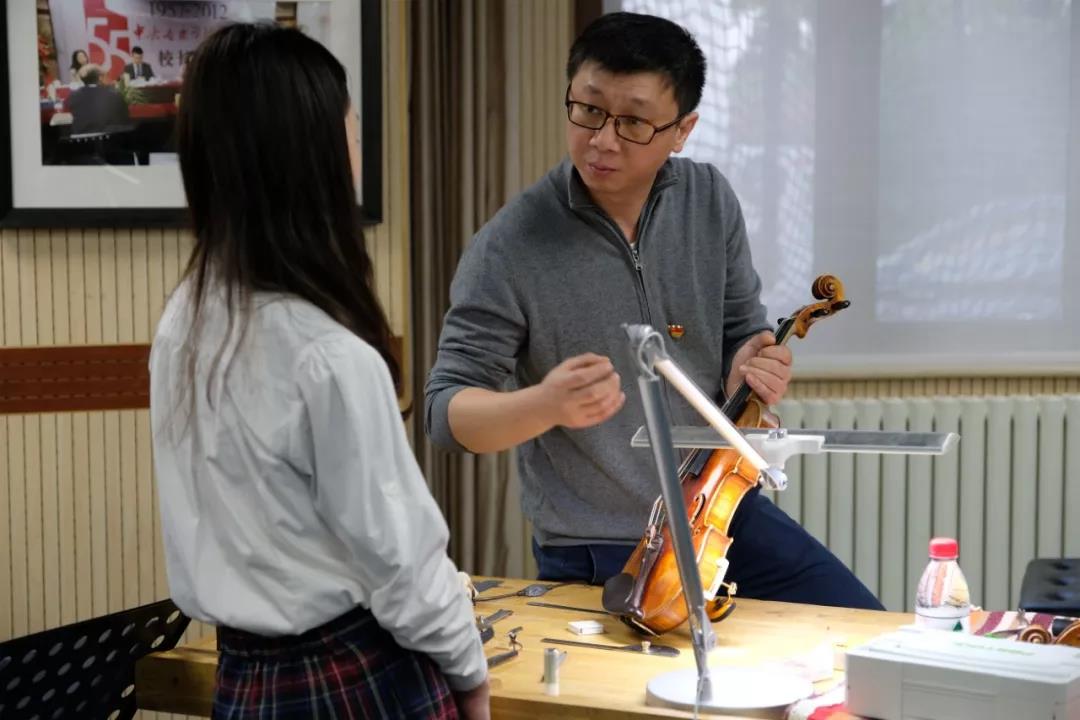 移步附中圆弧厅,附中少交的同学们用未经调试的乐器演奏了维瓦尔第的《秋》。琴声美妙,却也偶见瑕疵。 高彤彤老师和逯翔老师坐在专用工作台前,俨然“提琴医生”,开始为同学们做提琴的现场诊断与调整。 老师们一边耐心讲解一边做调整, 同学们也在指导下多次试奏来找到他们心目中想要的声音。