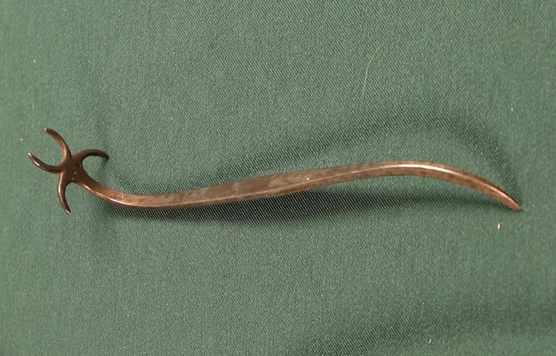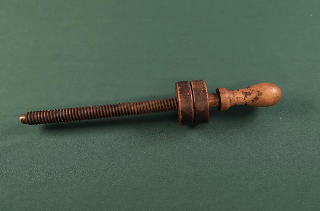 12、19世纪晚期儿童提琴音柱钳。线条优美流畅,独具匠心。音柱钳主要是用来安装和移动调整琴箱内部的唯一不被粘合的音柱的位置。该音柱钳设计巧妙,弯度适合,能够为该项工作的进行降低很多难度。