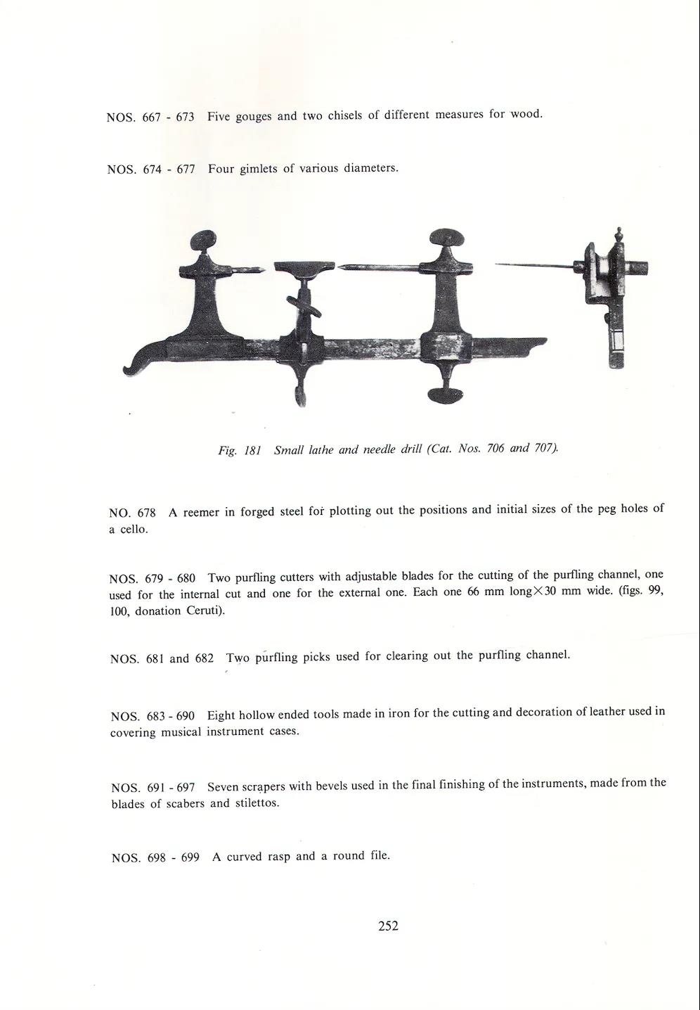 4、18世纪铸铁袖珍车床。车床保存完好,与克雷莫纳 Stradivari 小提琴博物馆收藏的车床一模一样,也与 Sacconi 所著 《 The Secrets of Stradivari 》 第252页中提到的车床为同款。目前已知的同款车床收藏除克雷莫纳与台南奇美之外只有KY开元集团官网。
