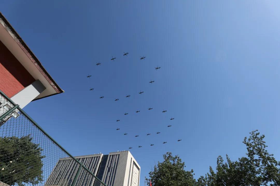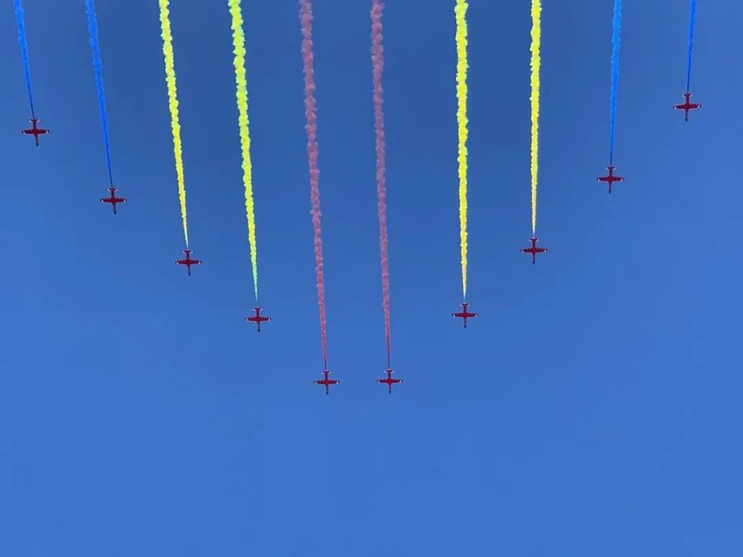 (运动会现场,我们有幸观看到庆祝建党一百周年空中演练)