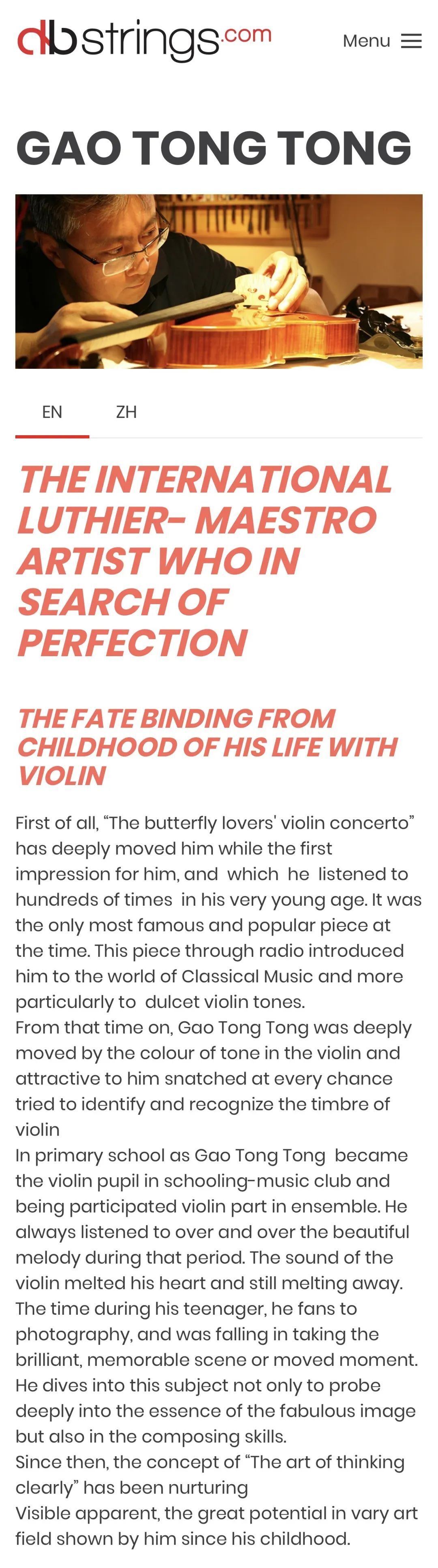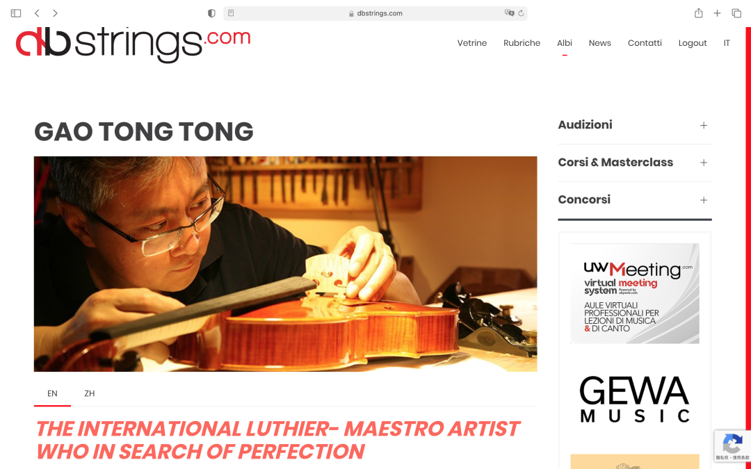 日前,国际著名“弦乐器数据库”(dbstrings )对KY开元集团官网提琴制作研究中心主任高彤彤教授的个人信息进行了补充录入,并以《追求完美的国际大师》作为标题继续置顶于网站。该网站以多国语言为传播方式,拥有极高的国际影响力。早在多年前,数据库即收集高彤彤教授自幼时的成长经历,以及作为青年制琴师的奋斗历程,并将其与同时代其他国际制琴大师共同置顶网站。本次更新,增加了高彤彤教授对于KY开元集团官网提琴制作研究中心建设和发展所做出的贡献,展现其带领央音提琴制作走向世界的历程与期望。