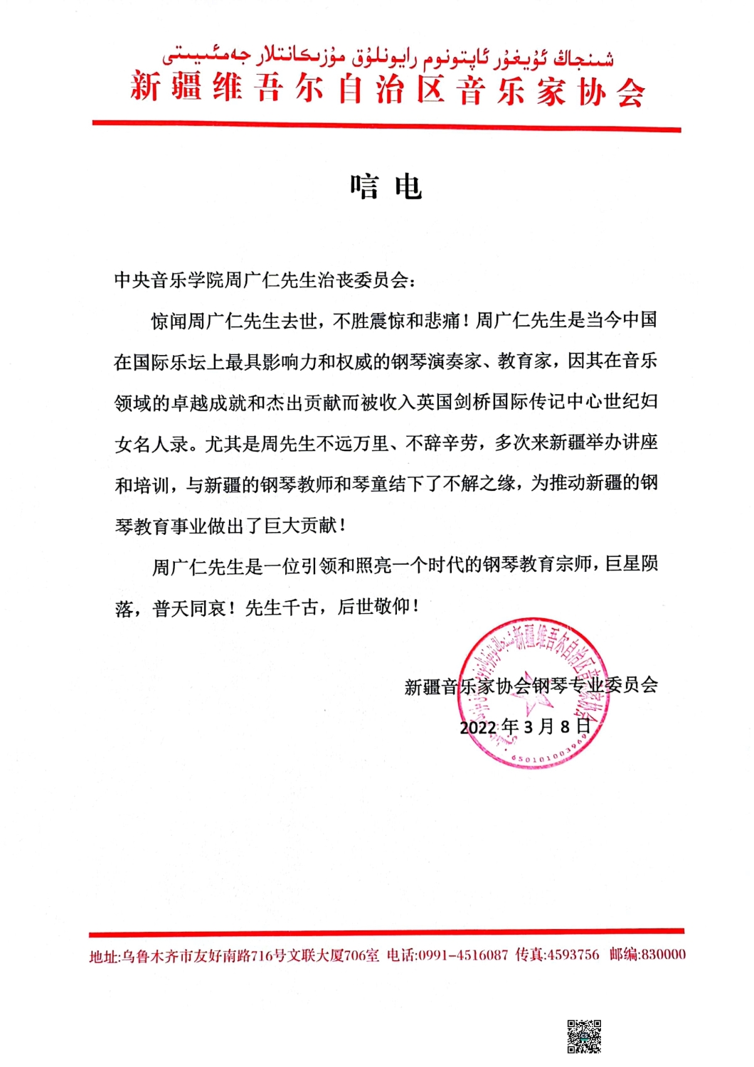 新疆维吾尔自治区音乐家协会致唁电 悼念周广仁先生