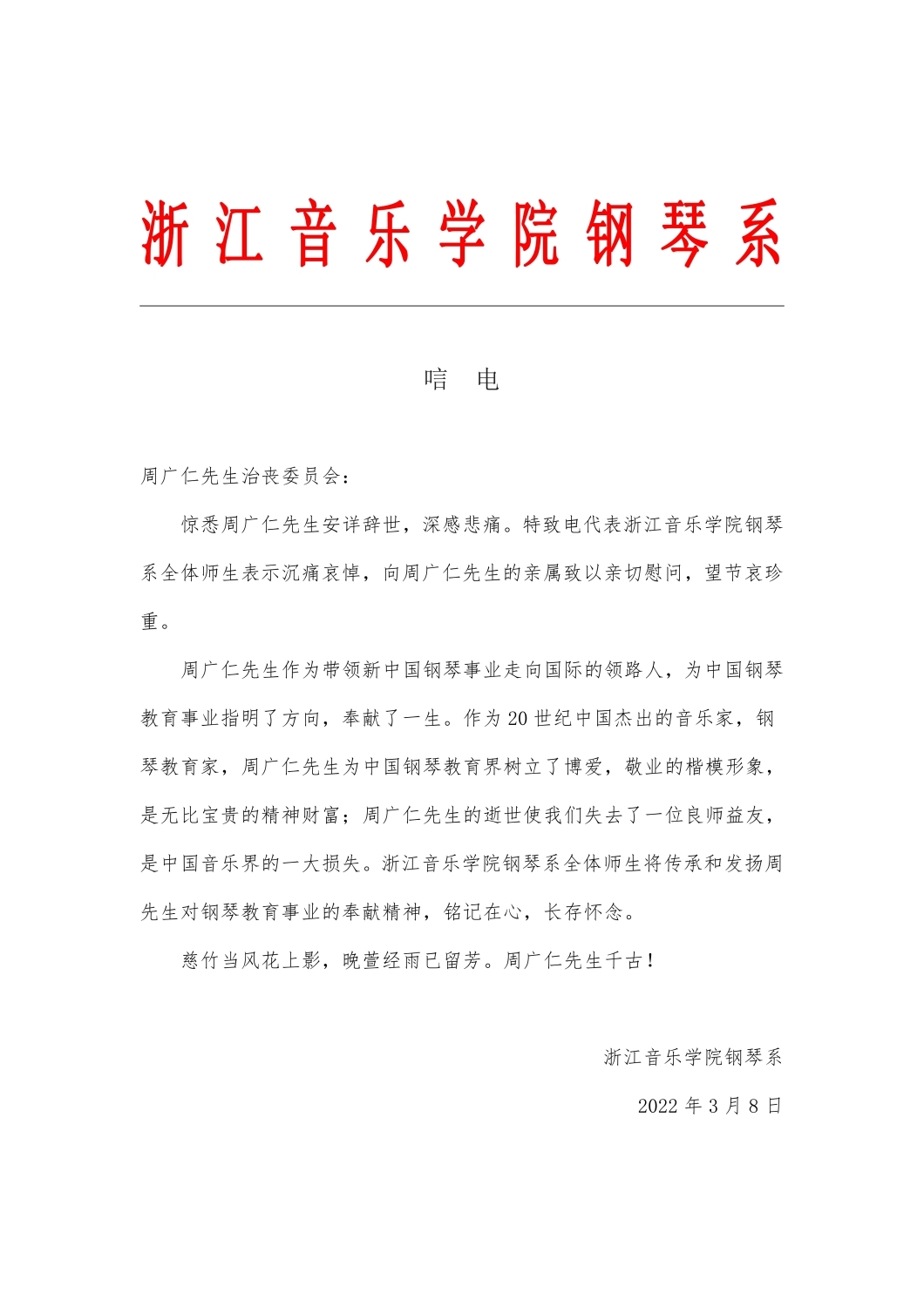 浙江音乐学院钢琴系致唁电 悼念周广仁先生