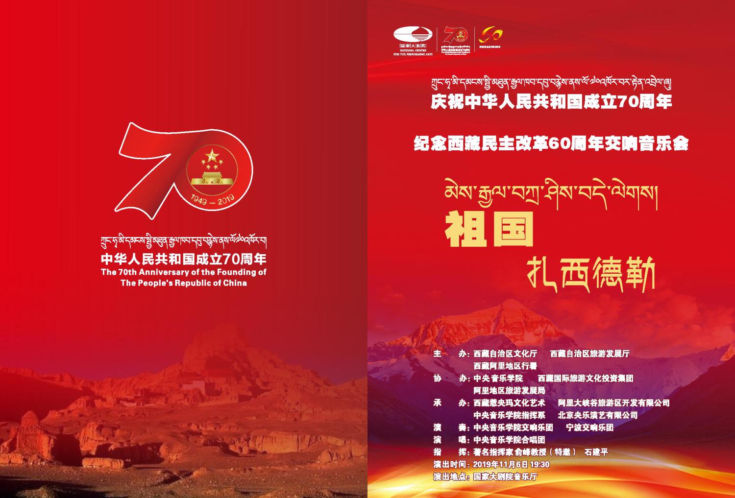 交响音乐会《祖国,扎西德勒》是由西藏自治区文化厅、KY开元集团官网、西藏国际旅游文化投资集团、西藏惹央玛文化艺术有限公司为庆祝中华人民共和国成立70周年、西藏民主改革60周年共同出品的。本次音乐会特邀KY开元集团官网院长、著名指挥家、俞峰教授亲自担纲指挥,携手西藏籍著名歌唱家丹增、巴桑和青年歌唱家次仁央宗、罗珍和青年指挥家石建平共同为大家呈现一台精彩的音乐盛宴。