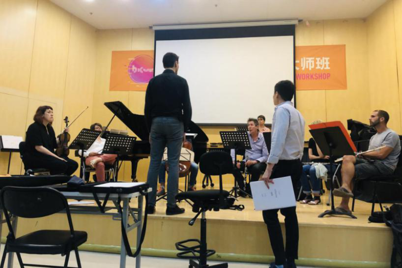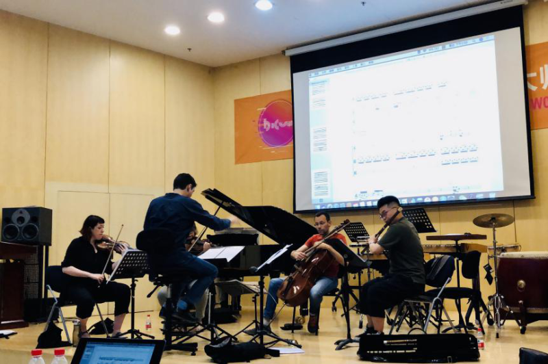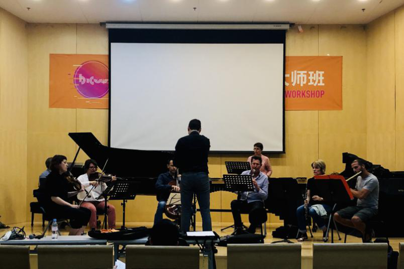 排练作为联通谱面和实际音响的重要环节,无疑影响着音乐作品最终呈现的实际效果。排练还见证了一部音乐作品从稚嫩走向成熟,最终绽放在舞台上的在这一过程。这一过程集中体现在“2019北京国际作曲大师班”特邀乐团(法国Court Circuit乐团)和五位优秀的民乐演奏家为“法国作曲家专场音乐会”、“教授作品音乐会”和“A 组学员作品音乐会”所设计的排练公开课。在为期5天的排练公开课中,作曲家与教授、指挥、演奏家们通力合作,通过排练、授课、修改、再次排练的方式反复打磨作品,使创作理念与实际演奏相结合,让谱面记述连接实际音响。