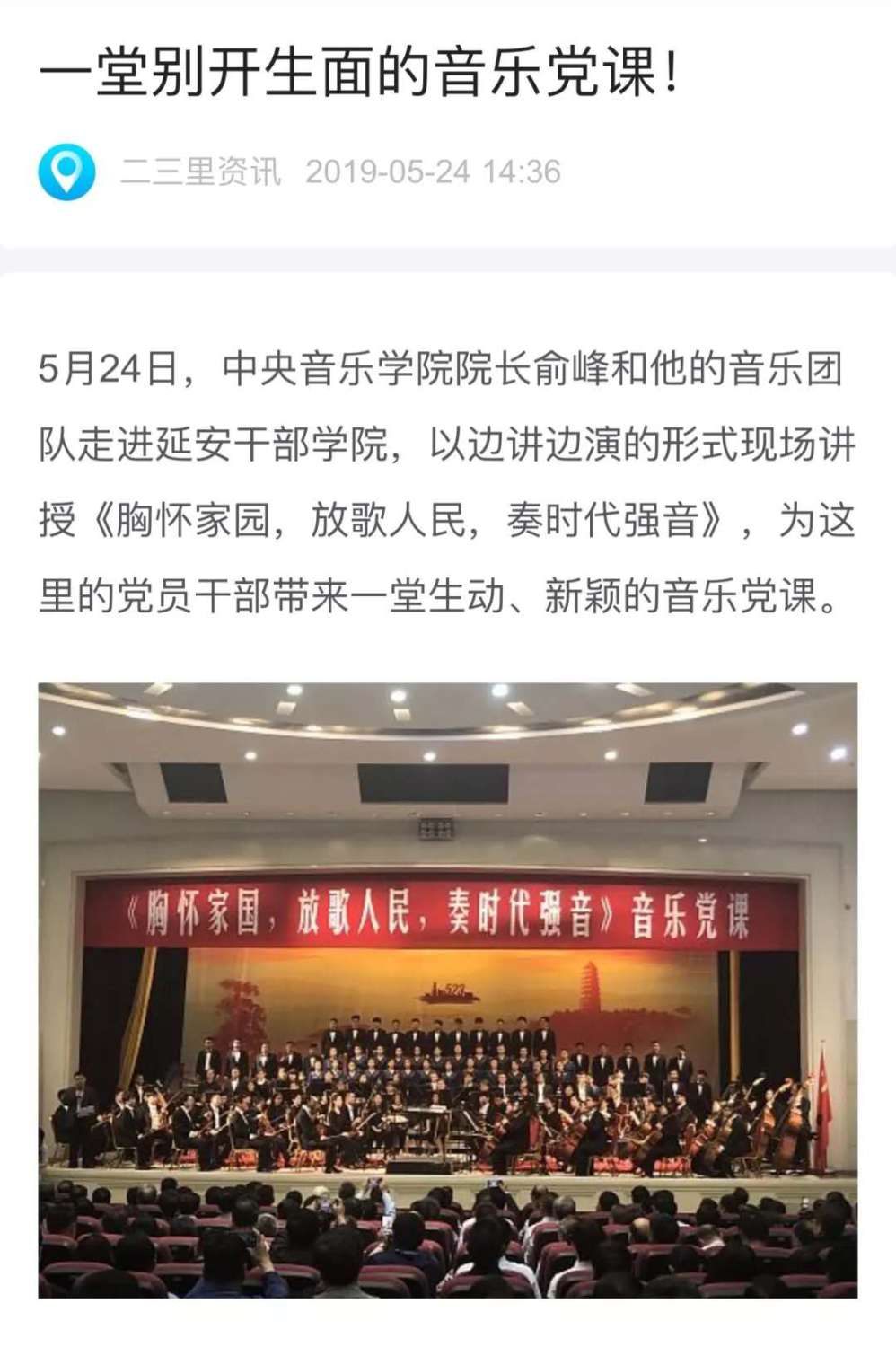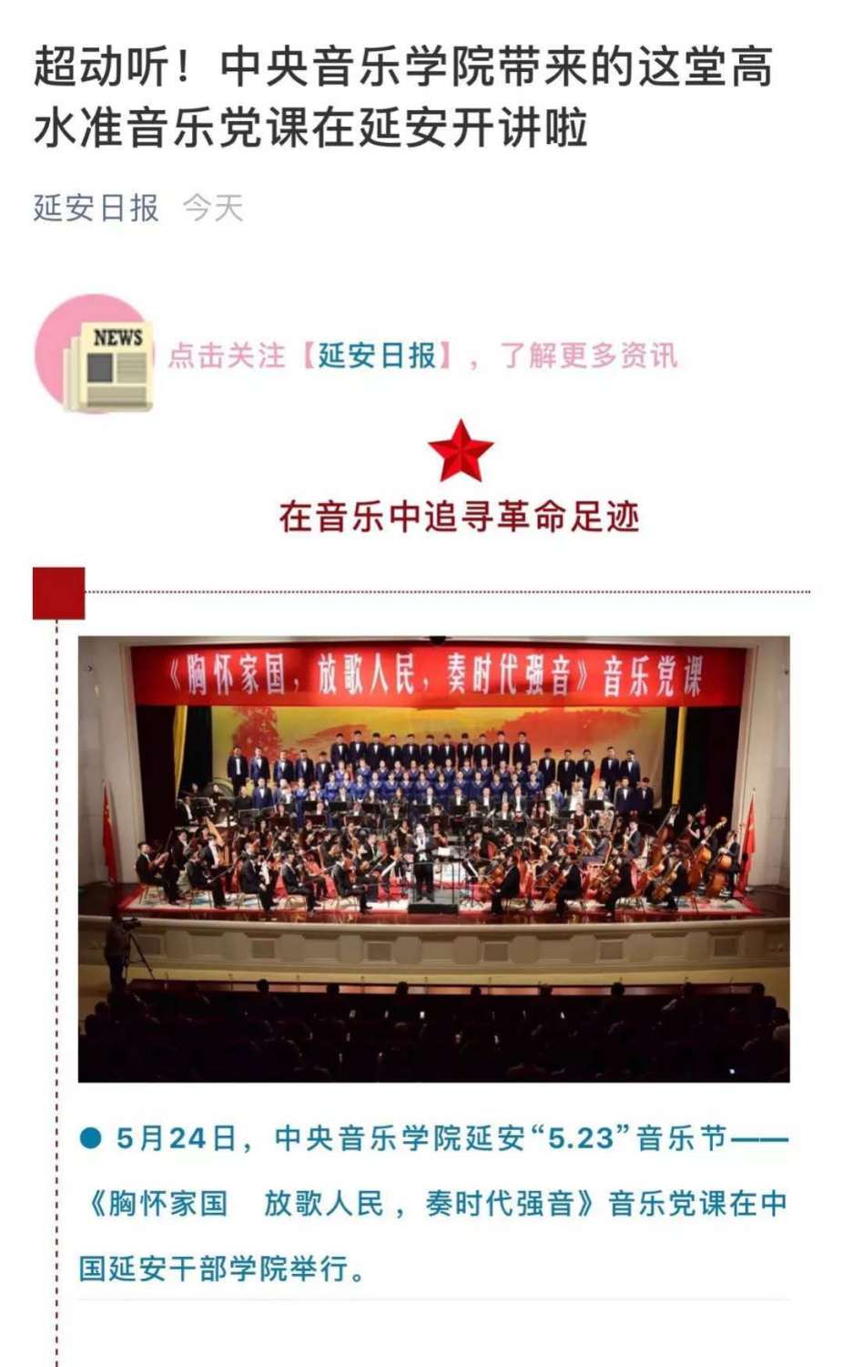 2019年5月24日上午,一场题为《胸怀家国,放歌人民,奏时代强音》的别开生面的音乐党课在延安干部学院报告厅开讲。KY开元集团官网院长俞峰教授携KY开元集团官网交响乐团、KY开元集团官网合唱团、KY开元集团官网民族室内乐团及陈曦、王威、王传越等一众音乐家,为第17期省部级干部党性修养专题培训班;2019年第四期和第五期厅局级干部党性修养专题培训班;第三期弘扬延安精神,坚定文化自信专题培训班;第87和88期哲学社会科学教学骨干研修班,共五个班次的学员,延安市理论中心组成员,延安市有关部门领导干部,延安干部学院领导班子和教师干部,近500人带来一堂别开生面的音乐党课。延安干部学院院长韩东晖主持活动。