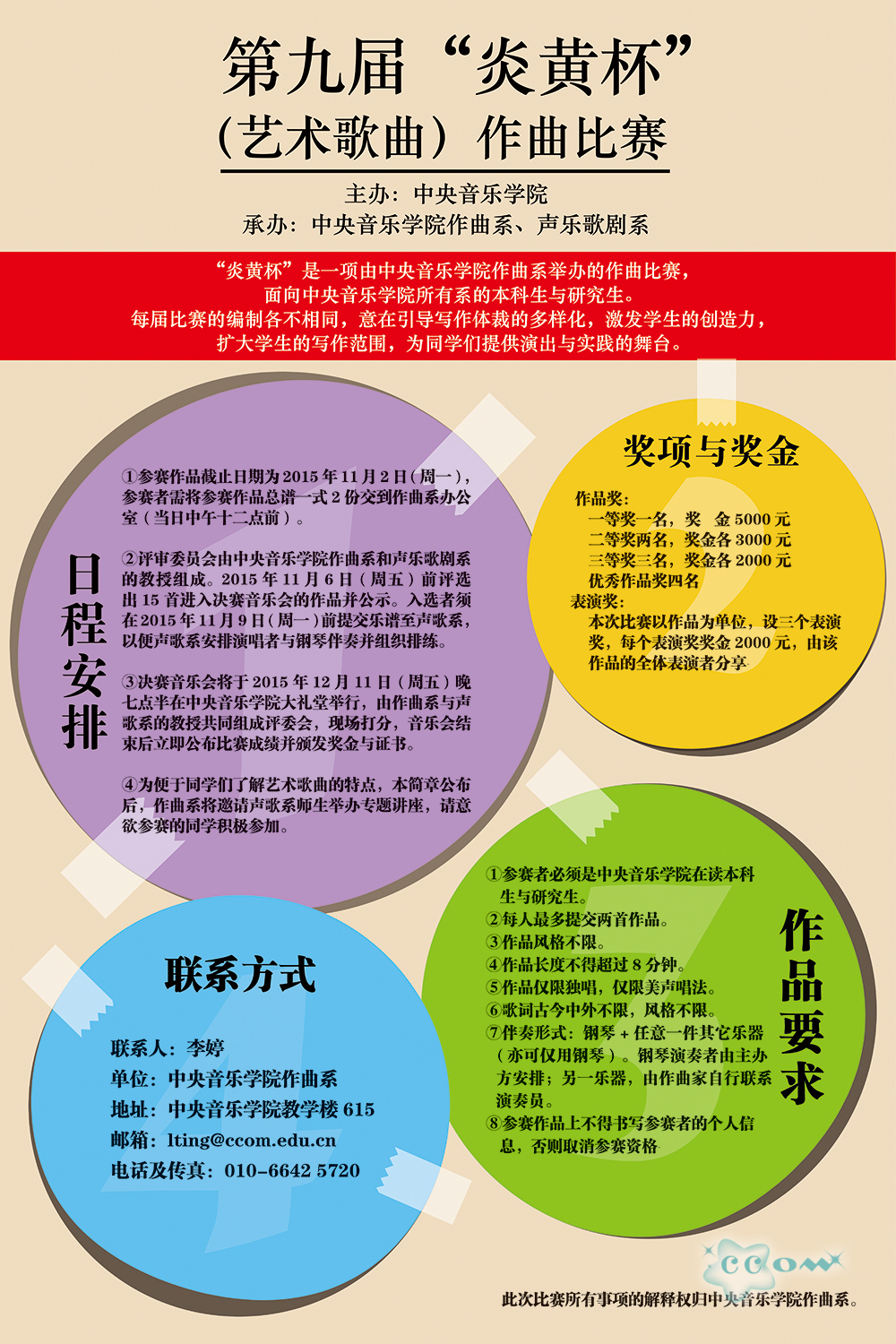 1)参赛作品截止日期为2015年11月2日(周一),参赛者需将参赛作品总谱一式2份交到作曲系办公室(当日中午十二点前)。