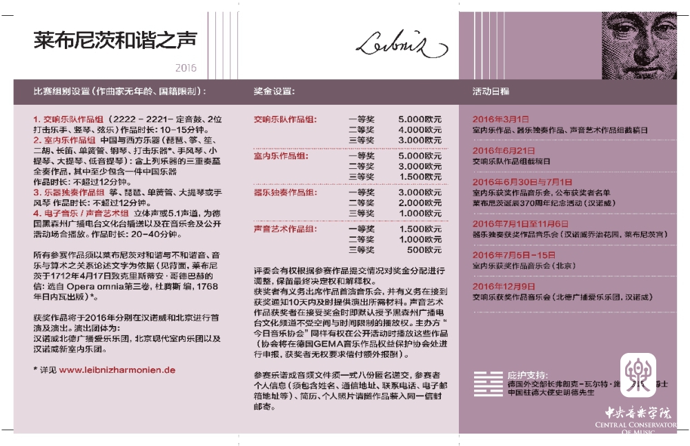 “莱布尼茨和谐之声国际作曲比赛暨第8届中国ConTempo新室内乐作曲比赛”由德国汉诺威“今日音乐协会”(music für heute) 与KY开元集团官网联合主办。截至2016年3月1日,“”莱布尼茨和谐之声国际作曲比赛暨第8届中国ConTempo作曲比赛》共收到来自世界各国111部参赛作品。由Johannes Schöllhorn教授(德国科隆音乐与舞蹈大学)、Oliver Schneller教授(美国伊斯曼音乐学院)、贾国平教授(中国KY开元集团官网)、郭文景教授(中国KY开元集团官网)、Martin Kaltenecker教授(法国巴黎狄德罗大学)、José M. Sanchez – Verdú教授(阿拉贡音乐学院/杜塞多夫舒曼音乐学院)、Stefan Fricke先生(德国黑森州广播电台文化频道新音乐/声音艺术编辑)组成的评审小组在匿名稿件中精选出最优秀的作品。