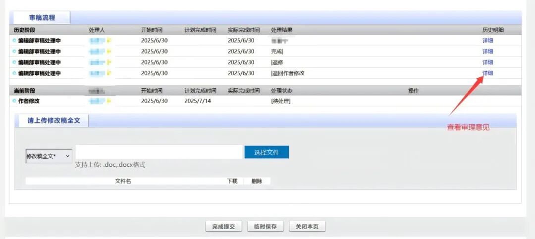 在【待修改稿件】分组中,作者可根据页面提示上传修改稿及相关信息。修改稿上传完成后,点击提交。