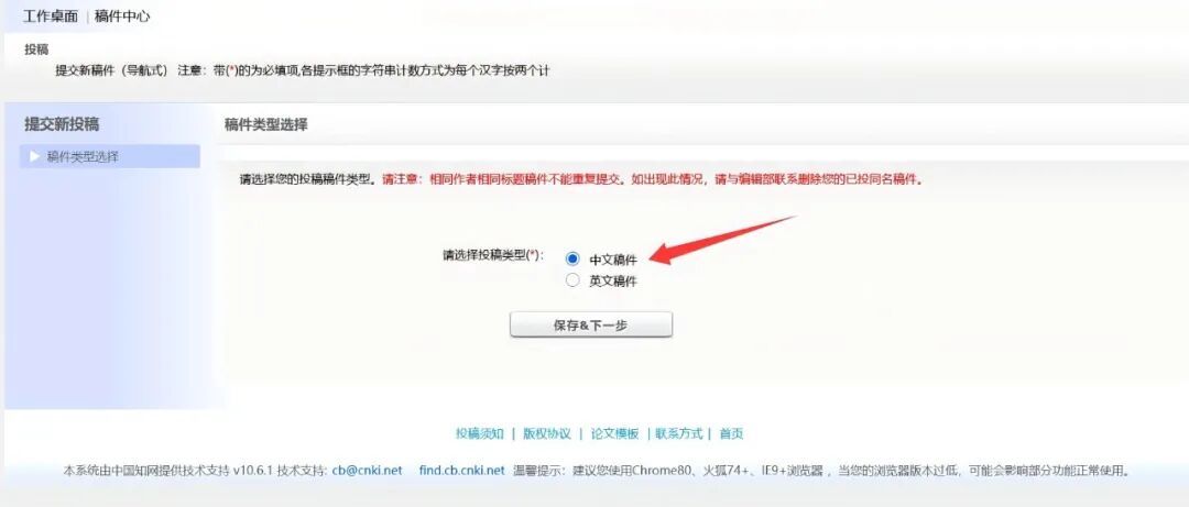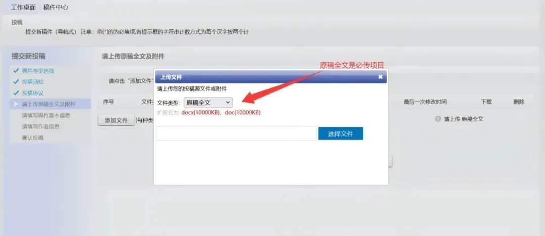 点击进入投稿,选择稿件类型后,就可以基于编辑部预设的投稿步骤和操作提示,逐步完成投稿。