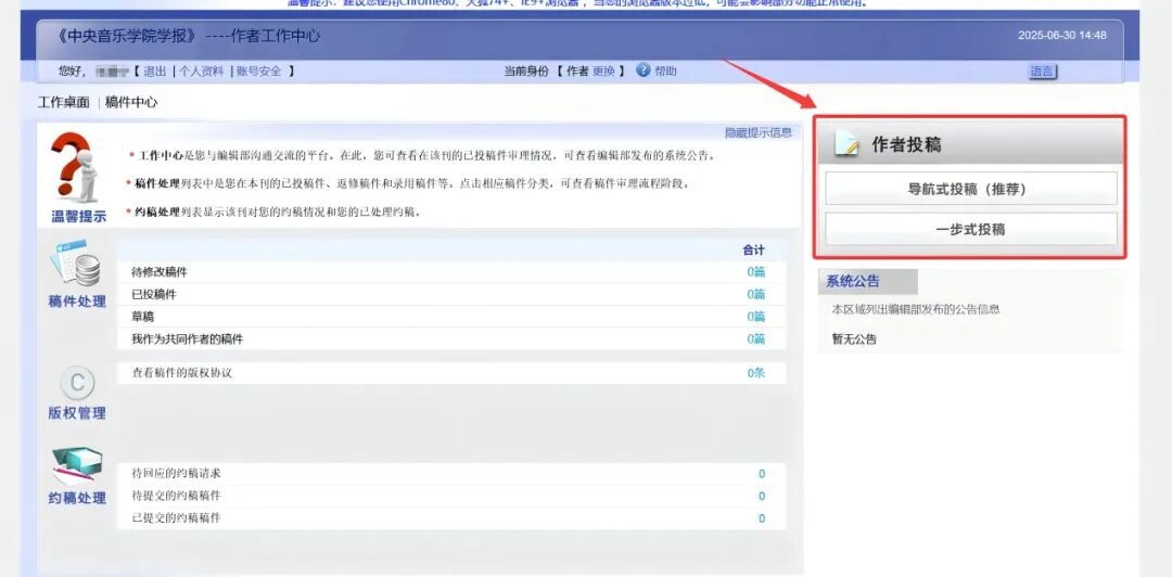 作者登录系统后,可通过【工作桌面】右侧的【导航式投稿】、【一步式投稿】模式完成。【导航式投稿】需按步骤分页操作,【一步式投稿】将相关步骤尽可能集成在极少页面中展示以减少作者点击次数。两种导航方式功能类似。