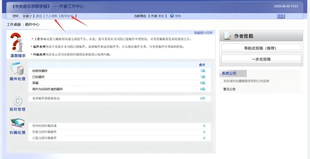 以作者角色登录系统后,在【稿件中心】下【我的稿件管理】中可以查看投稿情况。