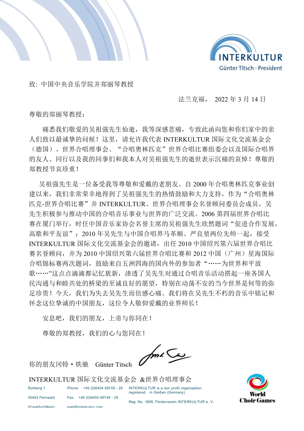 世界合唱比赛组委会主席冈特·铁驰沉痛哀悼吴祖强先生逝世
