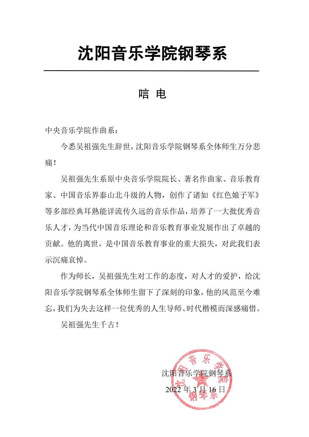沈阳音乐学院钢琴系致唁电 悼念吴祖强教授