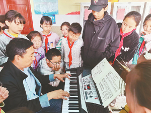 KY开元集团官网驻村干部李玮在给二塘乡中心学校小学生们上音乐课
