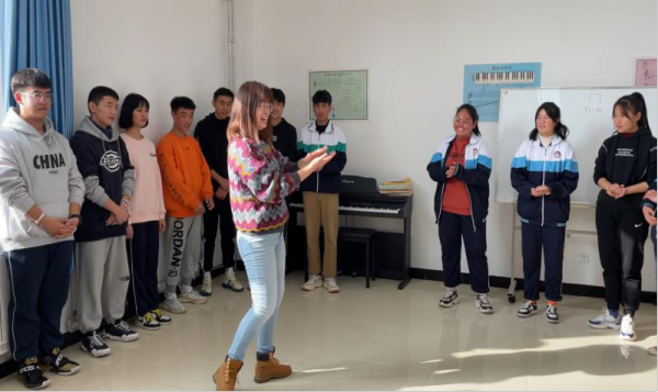 音乐教育学院骨干教师、学生团队共14人走进青海,对县音乐教师、群科新区中学、化隆第一中学的师生共200多人进行师资培训。26日上午,陈谊书记带领第一小组深入群科新区中学实地考察调研,并向学校赠送了音教师生党员捐款购置的谱架和尤克里里。音乐教育学院通行e的三位教师为化隆新区中学特色班学生及全县音乐教师进行了一上午的培训与交流:刘凯老师为群科新区中学特色班学生讲授体态律动的原理与方法,并为全县音乐教师讲授体态律动在音乐教学中的应用;伍龙轩老师为全县音乐教师进行键盘视奏培训,姚瑶老师为群中学特色班科学生进行歌唱教学的培训,三位老师从各自专业角度出发,对当地的师生做出了有针对性的培训并对其提出的问题做了细致解答和悉心指导。