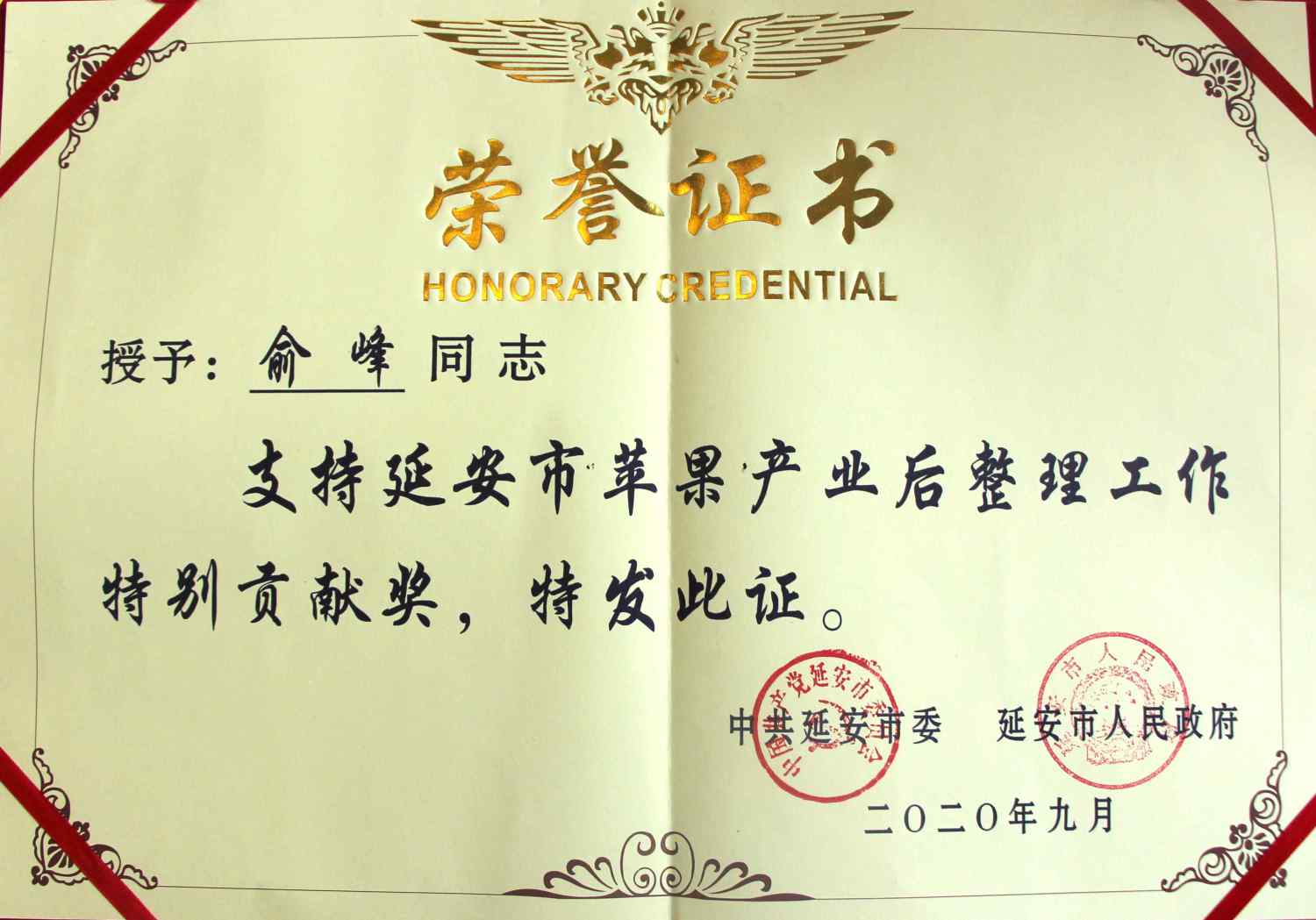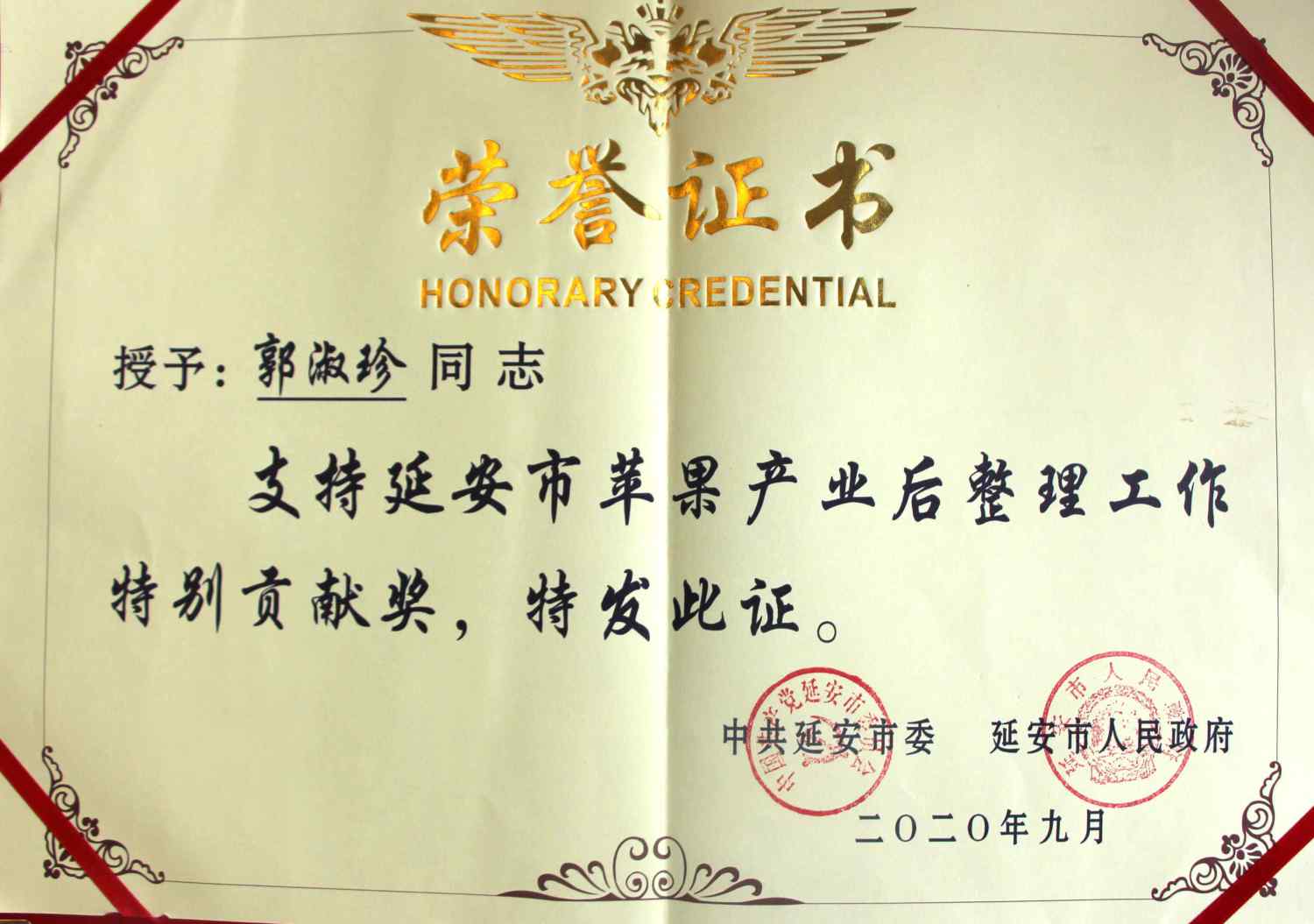 薛占海市长为俞峰校长、郭淑珍教授授予“支持延安市苹果产业后整理工作特别贡献奖”,答谢他们为延安苹果代言。