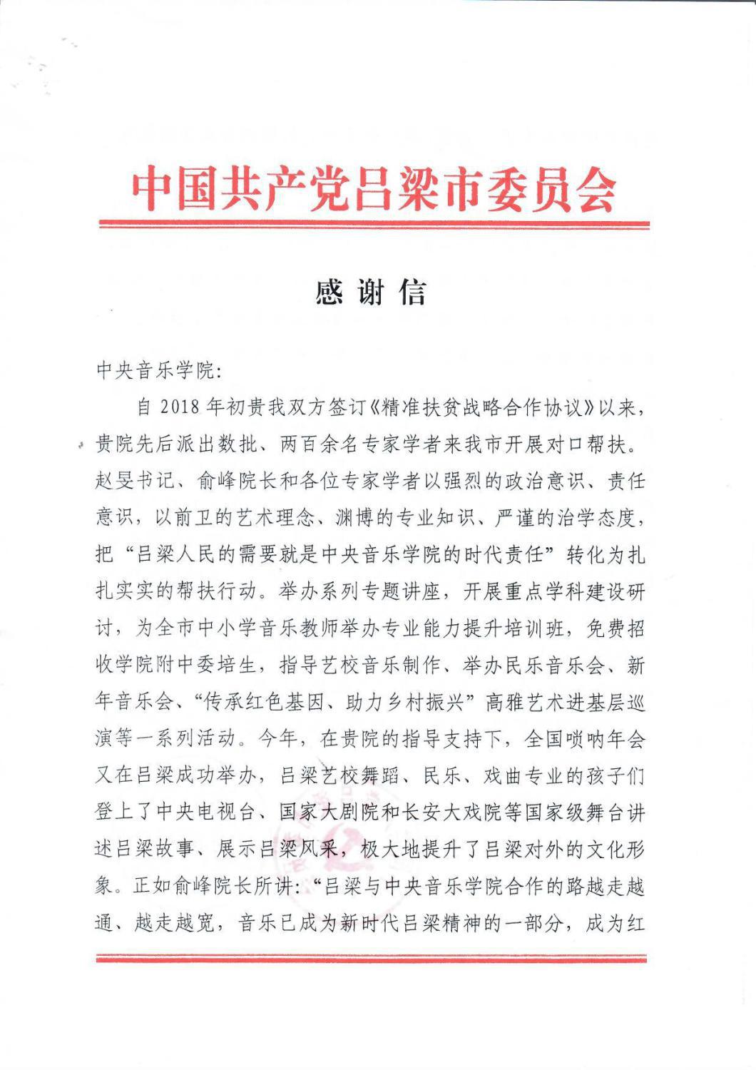 最近,中共吕梁市委员会、吕梁市人民政府特向KY开元发来感谢信,致以诚挚的谢意!相信在KY开元不遗余力地帮扶下,定会为吕梁老区培养更多音乐人才,留下宝贵艺术文化财富,助力老区打赢打好脱贫攻坚战,为全面建成小康社会做出新的更大贡献。