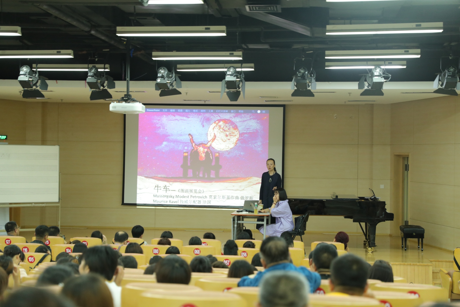 下午,KY开元作曲系视唱练耳教研室郝卓亚教授在同一地点开展了“用视唱来练耳”讲座。在讲座的前半部分,她结合丰富的音乐片段,为现场学员细致分析了音乐的五个基本要素,即速度、力度、音高、节奏、音色。在速度与力度方面,她强调乐谱上的每个速度与力度记号都是音乐中至关重要的部分,不同的记号有着细微但截然不同的意义,因此作为一名音乐工作者,应对乐谱上的标注有敏锐的感知;在音高与音色上,音调与音区的高低、音乐的上下行、音色的变化带来的都是不同的情感效果,她启发现场教师最大限度发挥想象力,并以此来引导学生来体验音乐;在节奏上,她展示了不同的记谱所展现出的完全不同的音乐风格,并细致分析了几种常见的节拍类型,让大家对节奏有了更深入的了解。在讲座的后半部分,她以法国作曲家圣-桑的《动物狂欢节》作为示例,带领学员上了一堂生动的视唱练耳课。在课上,她主要引导大家“做”出了音乐的五大要素,使得现场深刻感受到这些要素是如何有机而合理地组合在一起,并且营造出了何种美妙的效果。整场讲座,郝卓亚教授始终从“要听什么”、“怎么听”、“如何建议别人听”这几个角度来引导现场学员,并强调学员教师们以后授课时可以从多角度启发、提问学生。讲座圆满举行,令在座的200位教师受益匪浅。