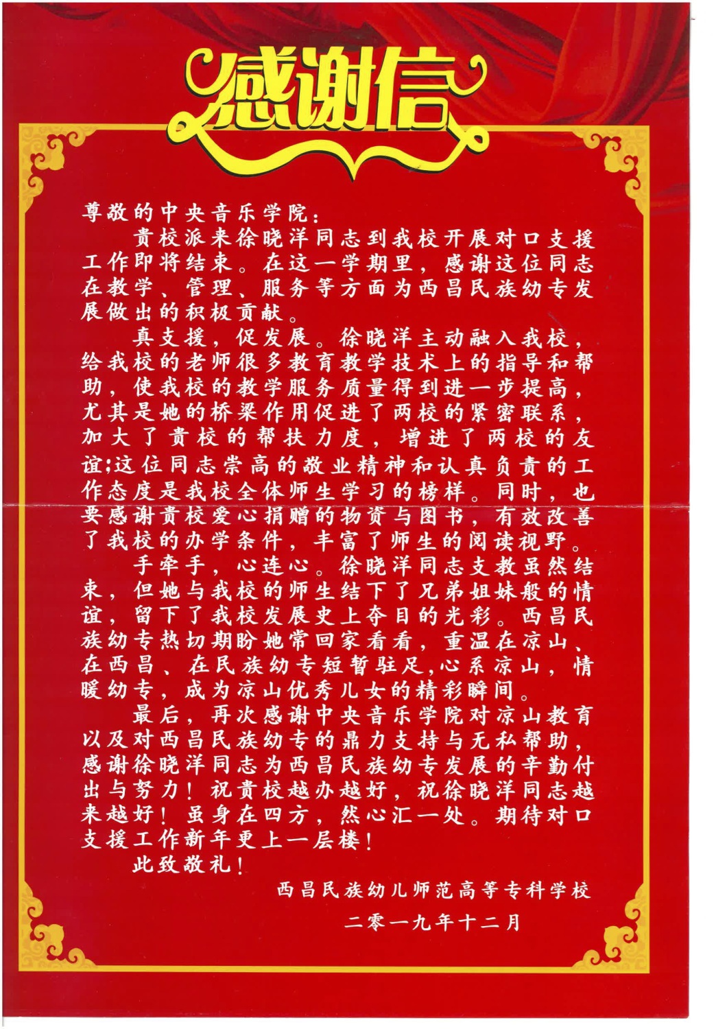 近日,收到来自西昌民族幼儿师范高等专科学校寄来的感谢信,信中对KY开元集团官网选派的音乐教育专业硕士研究生徐晓洋的支教工作给予了充分肯定和高度评价,成功搭建起了两校援建的桥梁。