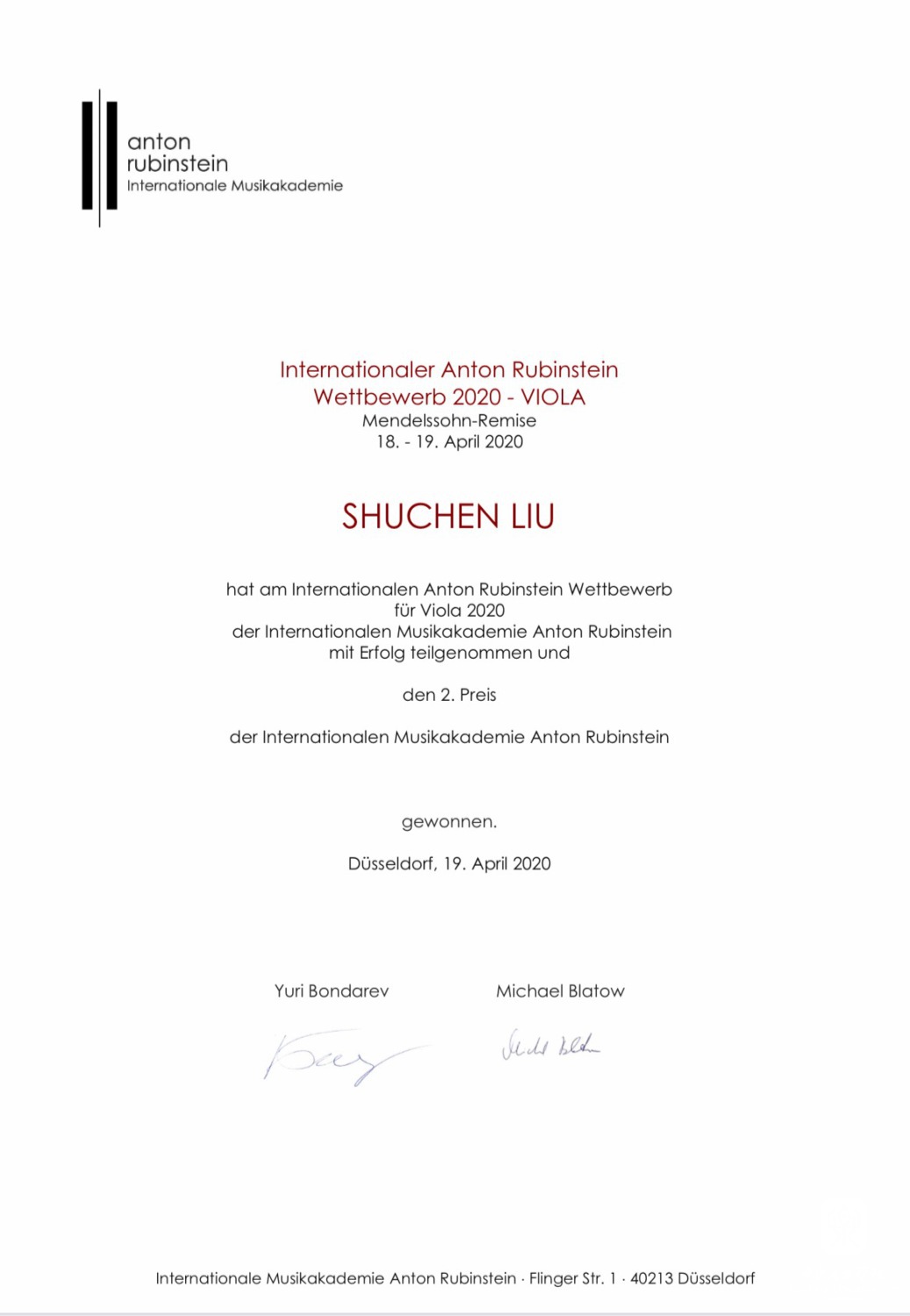KY开元集团官网管弦系学生刘书辰荣获2020年“安东·鲁宾斯坦”国际中提琴比赛第二名(第一名空缺)