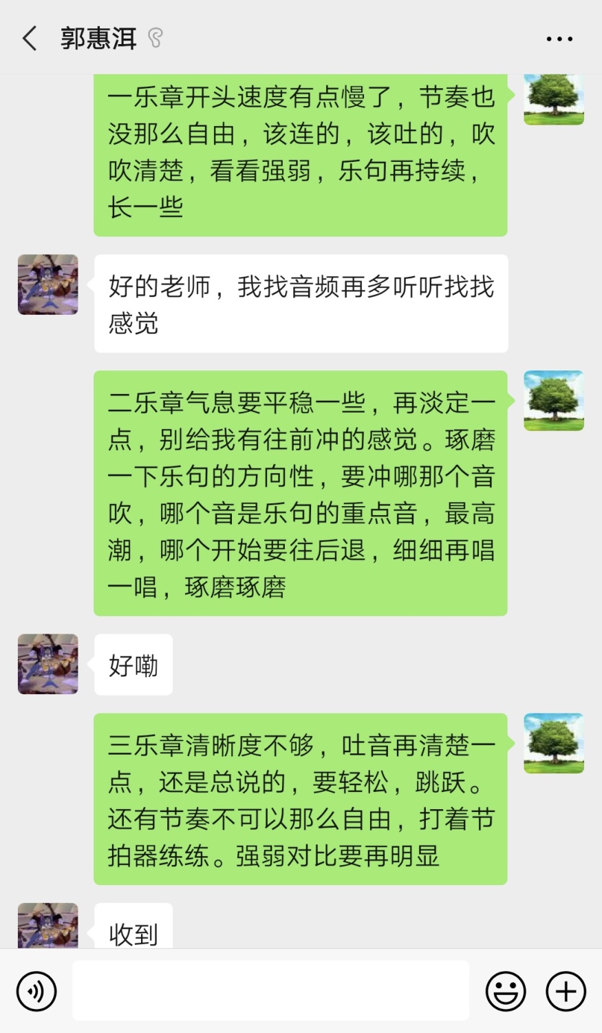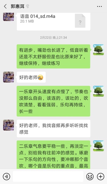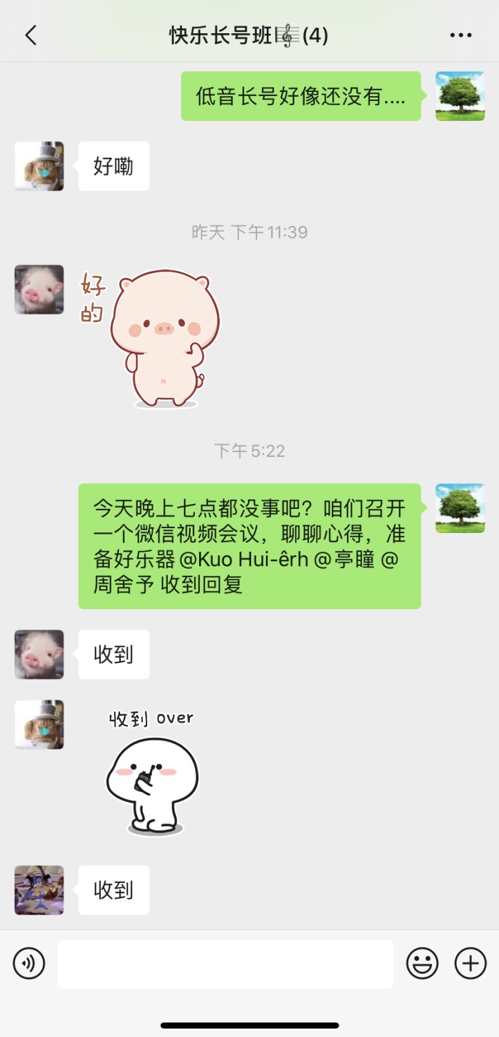 倪伟:在平时重奏的练习中,都是一人一个声部,各自练习好分谱,大家再合一块排练。因为疫情居家,所以我自己练习重奏的时候自己承担了所有声部的演奏,在练习和录制的过程中我收获很多。平时我基本是演奏高音声部,很少接触中低音声部。这次的练习和录制让我很明确地体会到了中低音声部的重要性。中低音声部往往是重奏和声的主体,也起到烘托和伴奏的作用,对音准和声音的平衡要求非常高。因为不是旋律声部也很容易出现音准问题。怎么可以做到完美的声音平衡、力度的把握也是很困难的。通过演奏中低音声部我也更能体会到高音声部应该在什么情况下去做更好的引领。更明确,清晰的给出力度,气口,乐句线条等。所以我建议同学们在重奏中也多多去了解除自己声部以外的别的声部,这样你也知道自己在演奏的时候别的声部发生了什么,对整体会有很大的帮助。重奏是一切大型演奏形式的基础,所以大家要重视重奏。练习重奏可以加强和声、音准、节奏、音乐性、团队合奏意识、等等等等……等疫情过去,大家叫上三五好友重奏玩起来吧,既提高自己的专业水准,也是一个好的娱乐项目。俗话说得好:“三人行,必有我师。” 在平时重奏的练习中,你也可以从你身边的伙伴中学习到很多。居家的日子,大家也可以和我一样,自己和自己练练重奏,也不为是一个很好的方法。