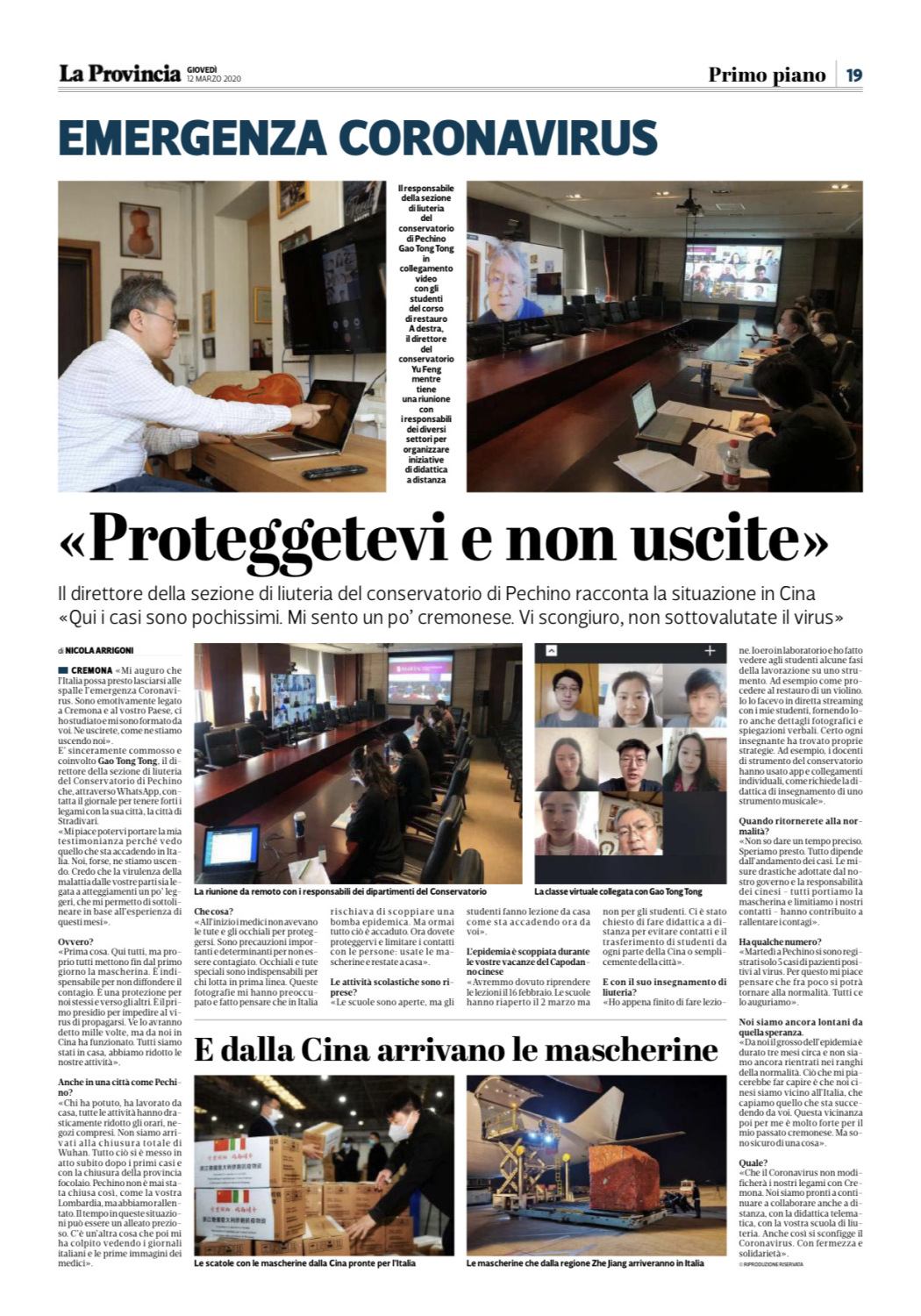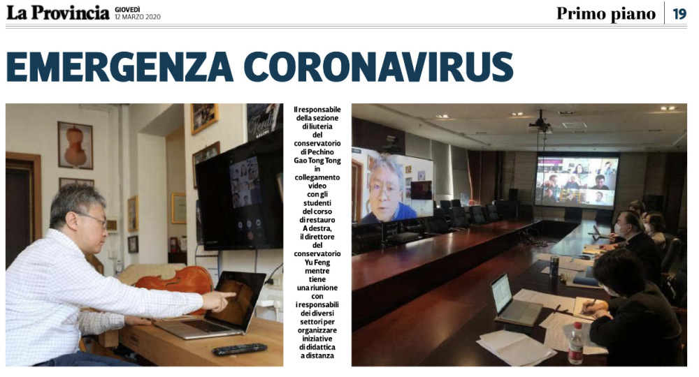 近日,在中国新冠病毒疫情防控形势渐趋平稳的时刻,来自世界疫情重灾区的意大利克雷莫纳当地报纸,连线采访了KY开元提琴制作研究中心副主任高彤彤教授,并以“保护好自己不要外出”为新闻标题刊登了采访内容,向意大利当地人民介绍了中国先进而有效的抗疫经验。采访中,意大利记者了解了中国目前疫情的发展状况,并询问了高老师本人对意大利当前疫情的看法与建议,同时还特别取经KY开元“停课不停学”的具体做法。