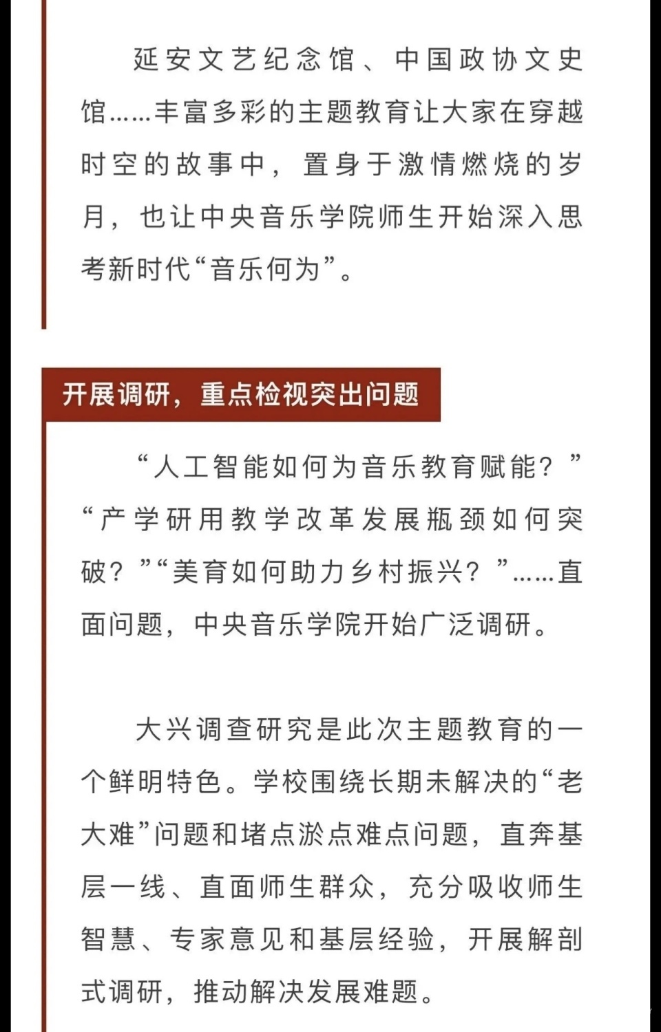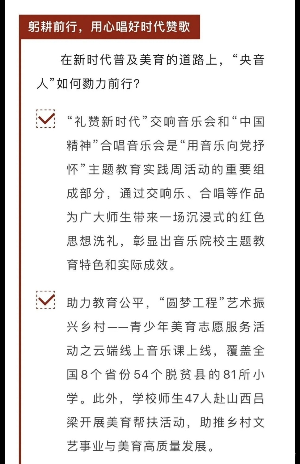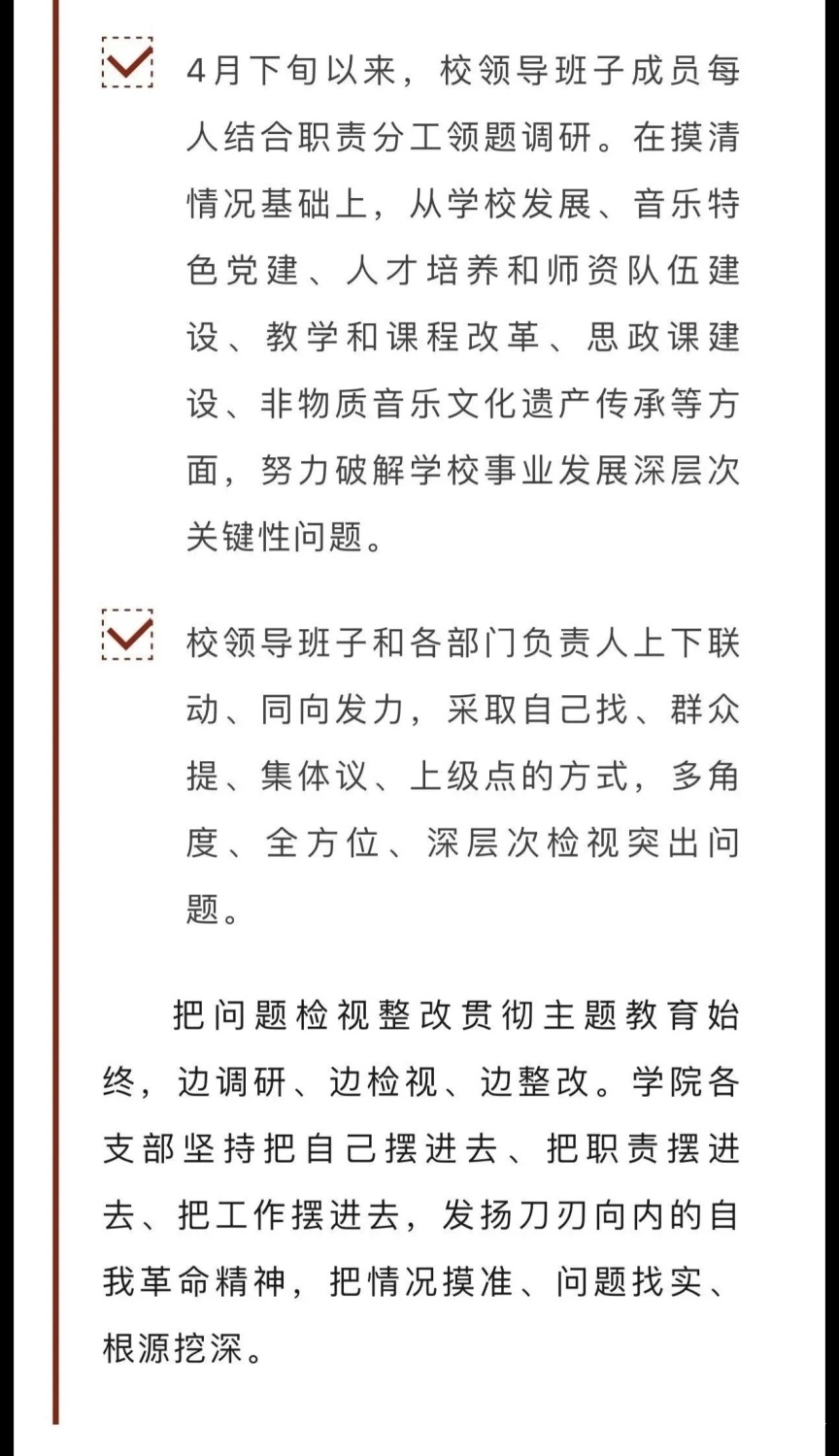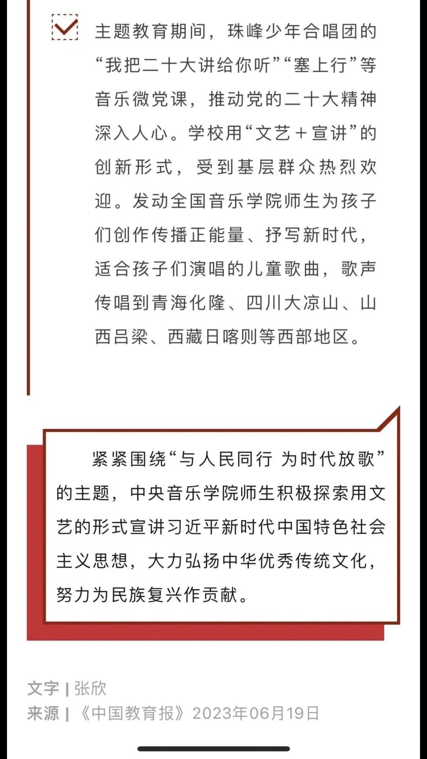 赓续红色血脉,以美育人培根铸魂。自主题教育开展以来,KY开元集团官网结合学校实际积极创新方式方法和活动载体,形成高质量党建引领高质量发展的鲜明导向。学校始终坚持以培养社会主义音乐艺术事业需要的德艺双馨高层次音乐专业人才为目标,坚持思想引领与艺术传授并重,坚持社会主义的办学方向,以文化人、以文育人,构建“大思政”育人格局,着力营造浓厚的育人氛围。