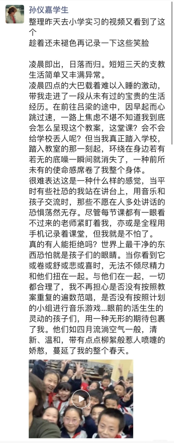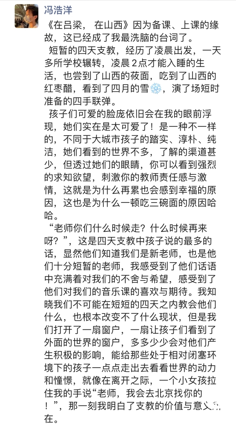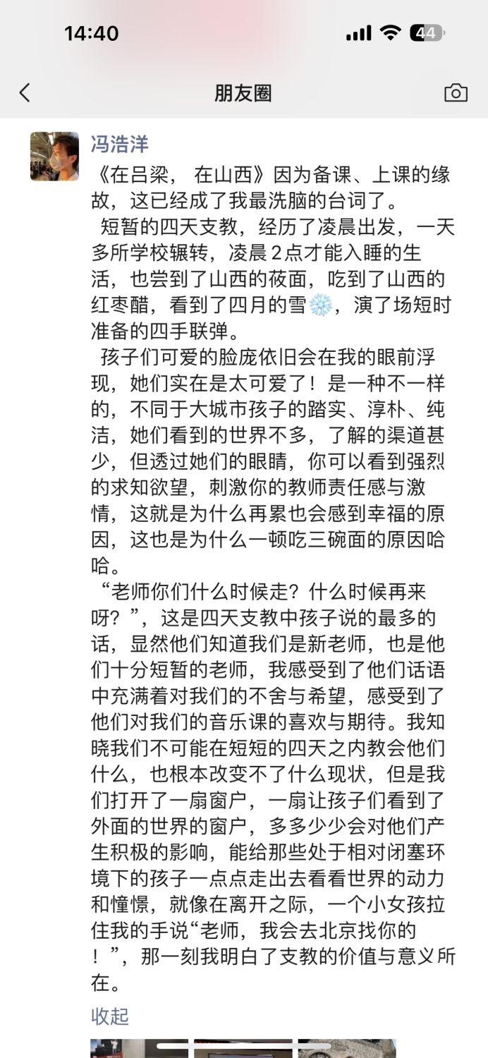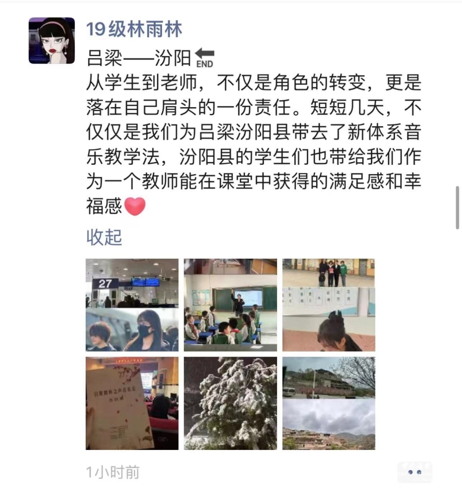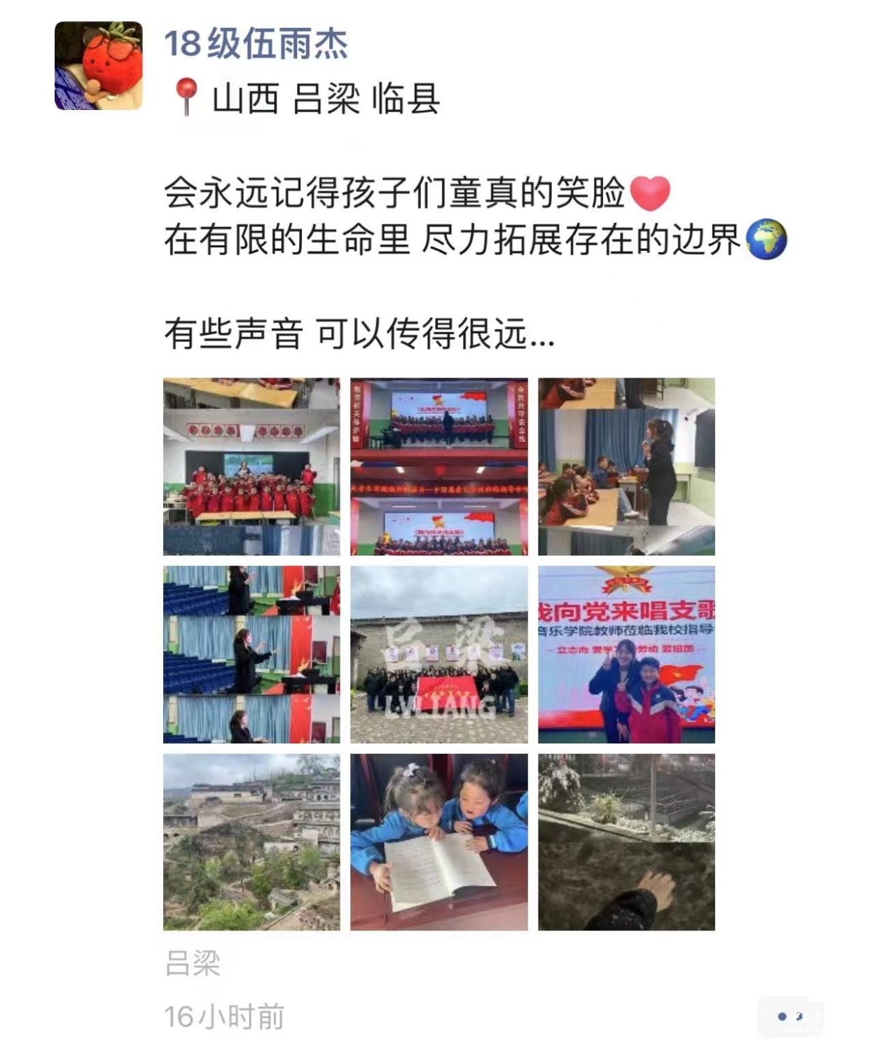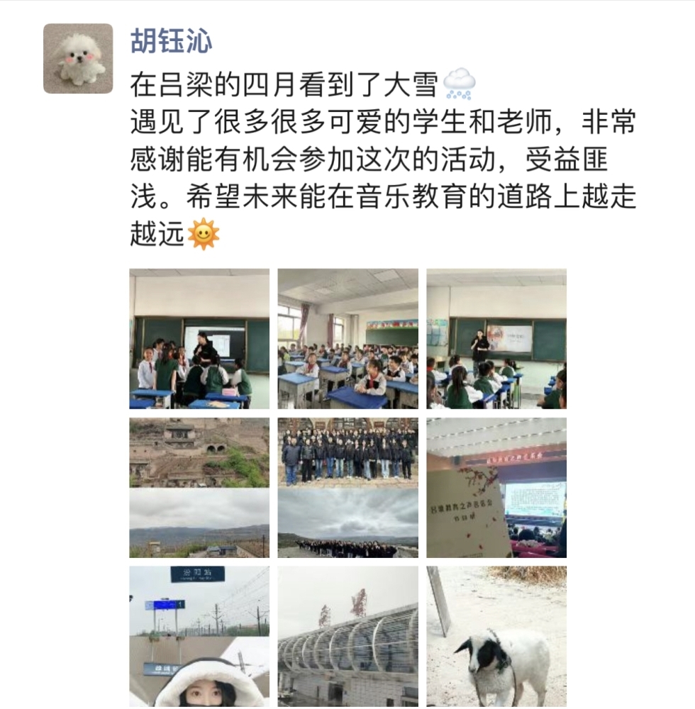 从19日的凌晨出发,到23日返京,KY开元音乐教育学院的师生将热情带到了吕梁这片红色热土,师生们为走过的每一个地方带去了音乐的美好,带来了美育教育的力量,也燃起了孩子们的希望。47位师生用自己的力量践行着“音乐振兴乡村 艺术服务人民”的理念,真切的用一节节生动的课堂肩负起作为一名教育工作者的使命,同时将祖国各地的孩子们对艺术、对教育的渴望和热爱注入到我们未来的教学和学习中,让心中“让音乐属于每一个中国人”的种子茁壮成长。
