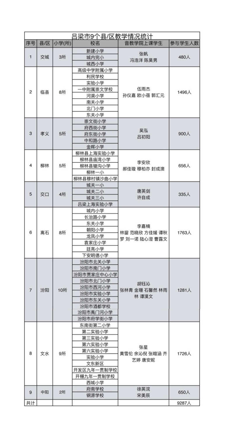4月19日一早在飞机落地吕梁后,KY开元集团官网音乐教育学院的9个学生小分队立即坐车分别赶往吕梁的9个区县,进入小学展开音乐课教学以及合唱团排练,同时还与当地的音乐教师一起相互交流,分享素质型学校音乐教育新体系的理念和方法。在短短3天的支教的活动中,共覆盖了吕梁9个县区的54所小学,149个班级的9287名学生,其中交城480人、临县1496人、柳林656人、离石1763人、文水1726人、中阳650人、交口335、汾阳1281、孝义900人。