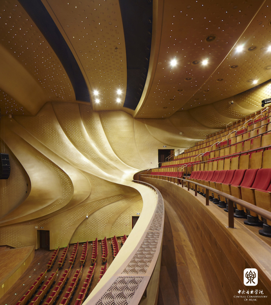 The Opera & Concert Hall features an auditorium and a stage designed with the inspiration of water ripples created by a water drop falling into a tranquil lake, a fan-shaped sloped ceiling of multi facets and carved walls designed like curves, creating an artistic effect of great power and beauty. In the near future, the CCOM Opera & Concert Hall will stand out as another performance venue in Beijing of extremely high functionality and artistic excellence.