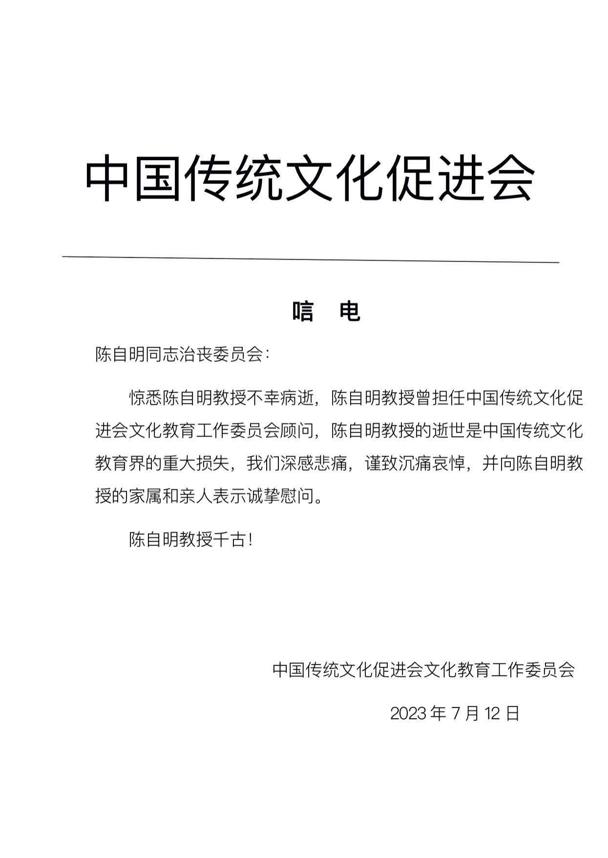 中国传统文化促进会致唁电 沉痛哀悼陈自明教授