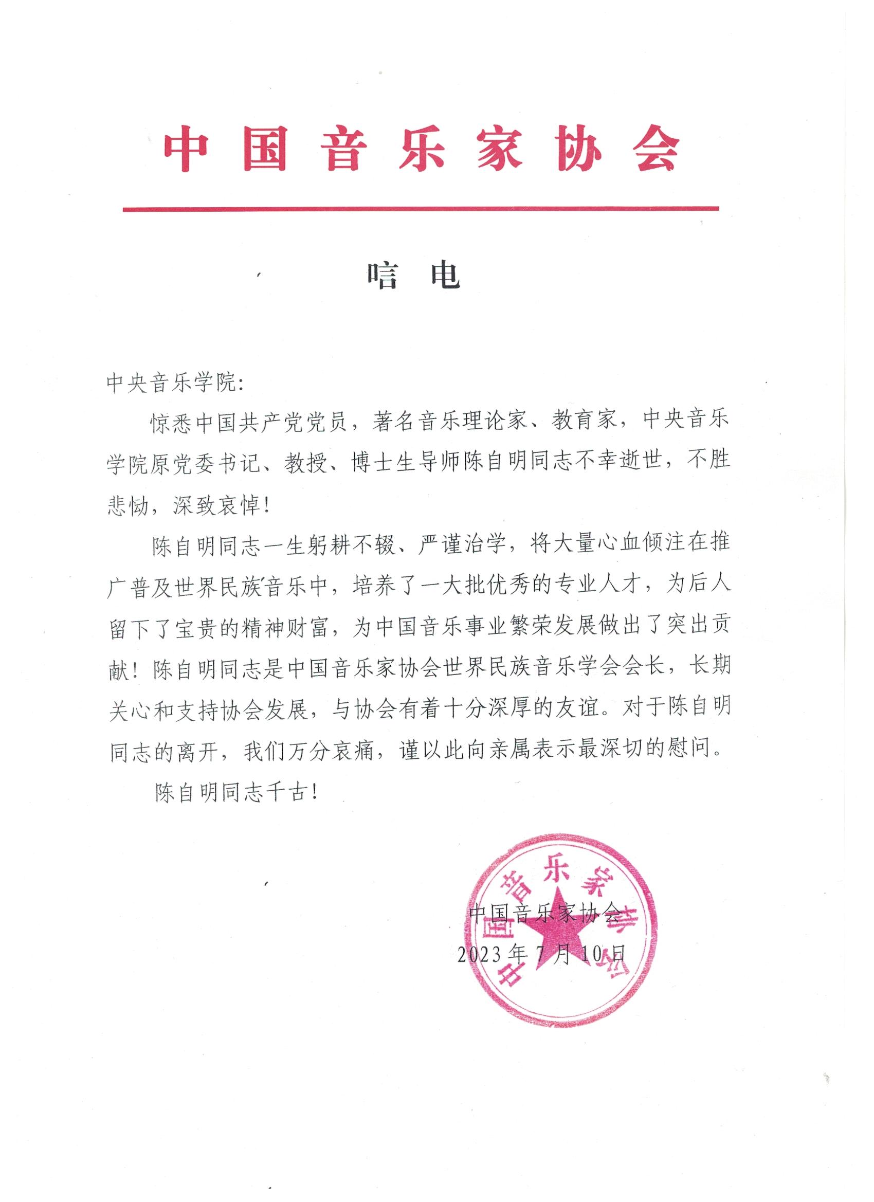 中国音乐家协会世界民族音乐学会致唁电 沉痛哀悼陈自明教授
