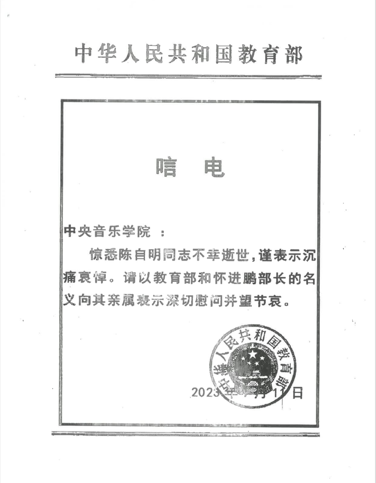中国音乐学院致唁电 沉痛哀悼陈自明教授